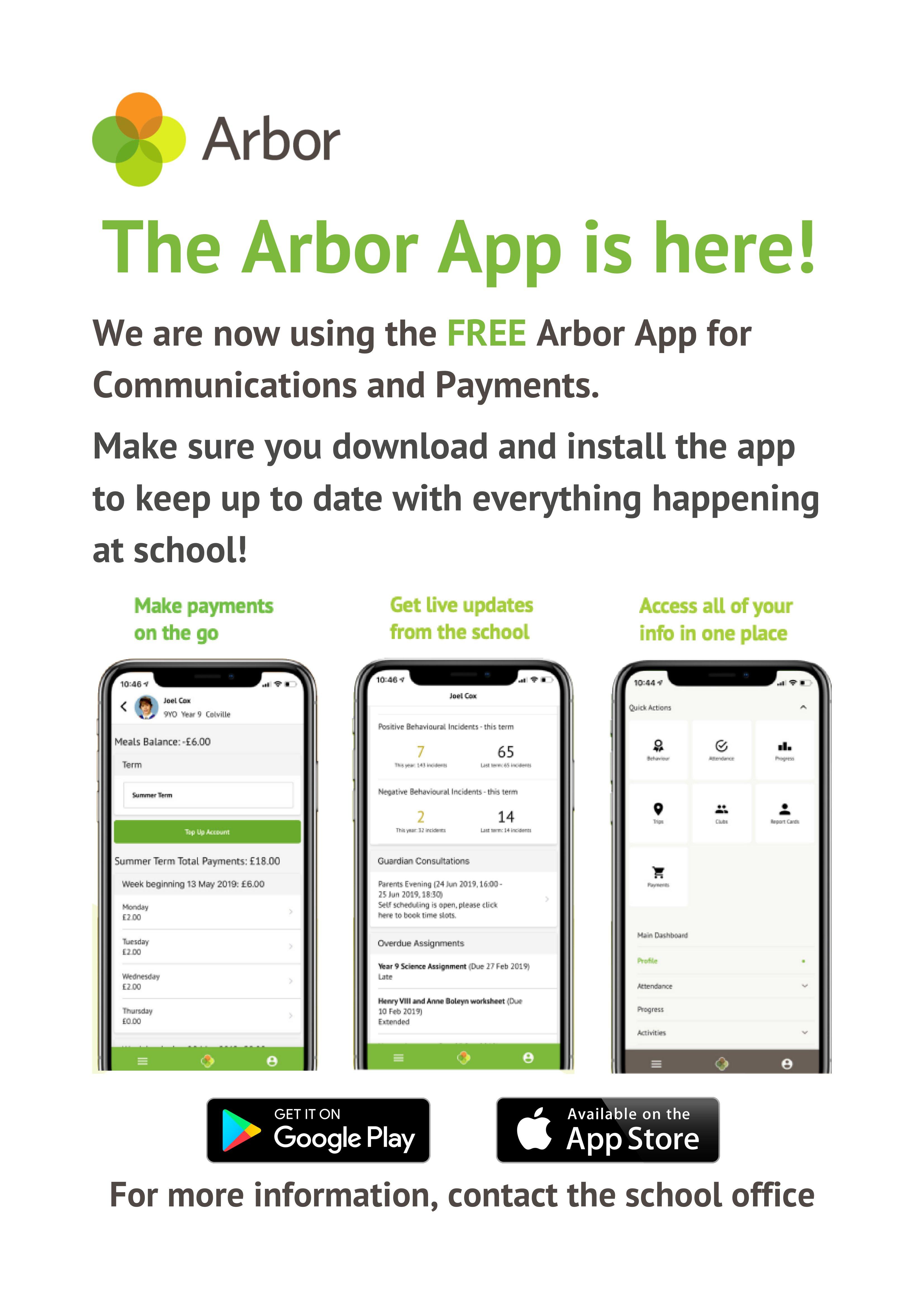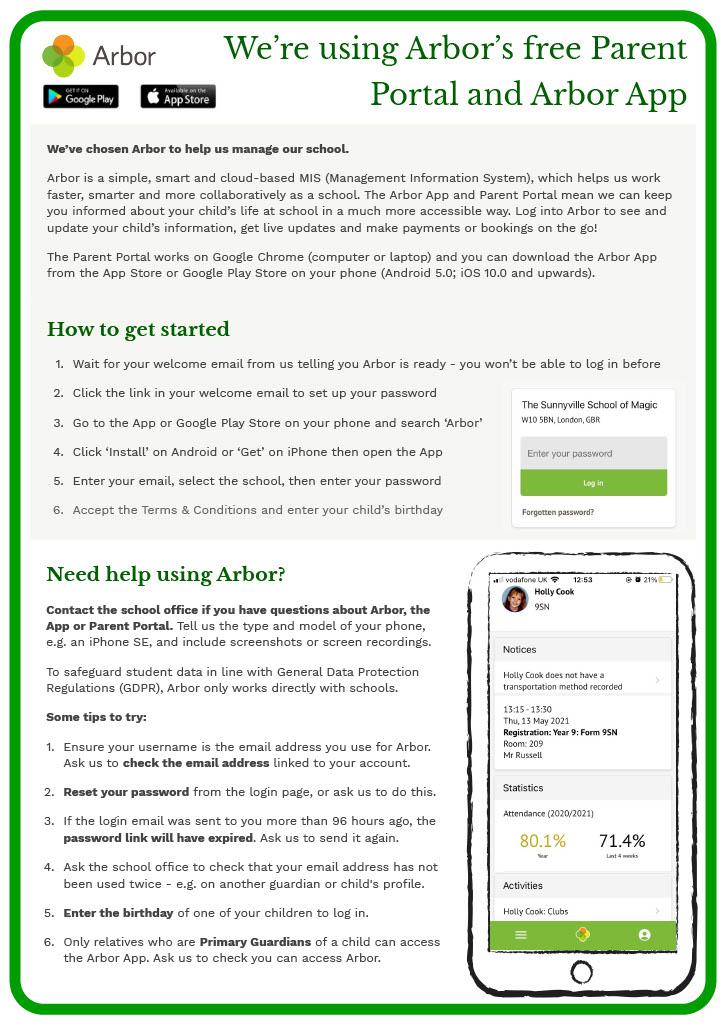 If you have any issues logging on or using the Arbor App or Parent Portal, please contact the school office.