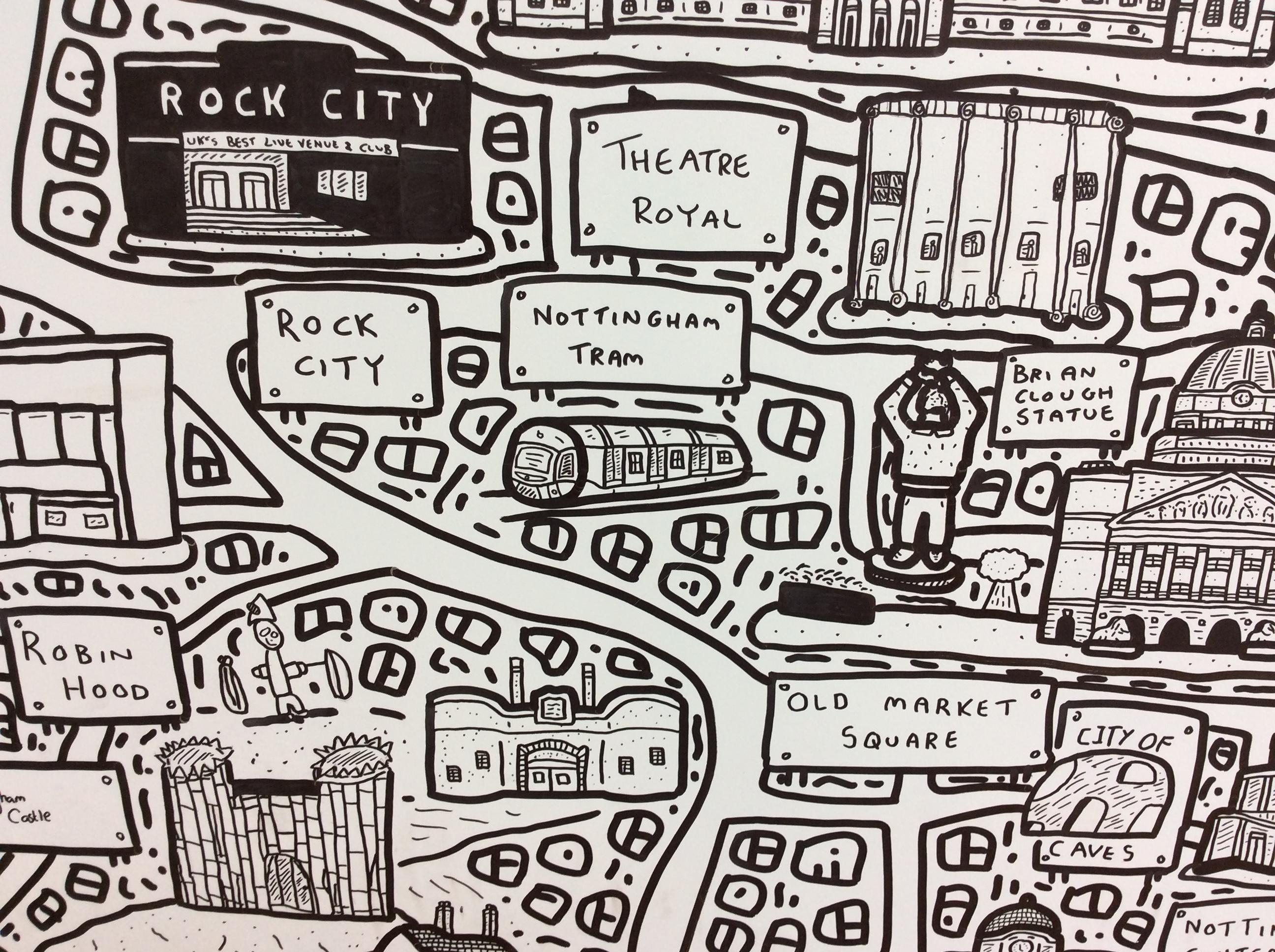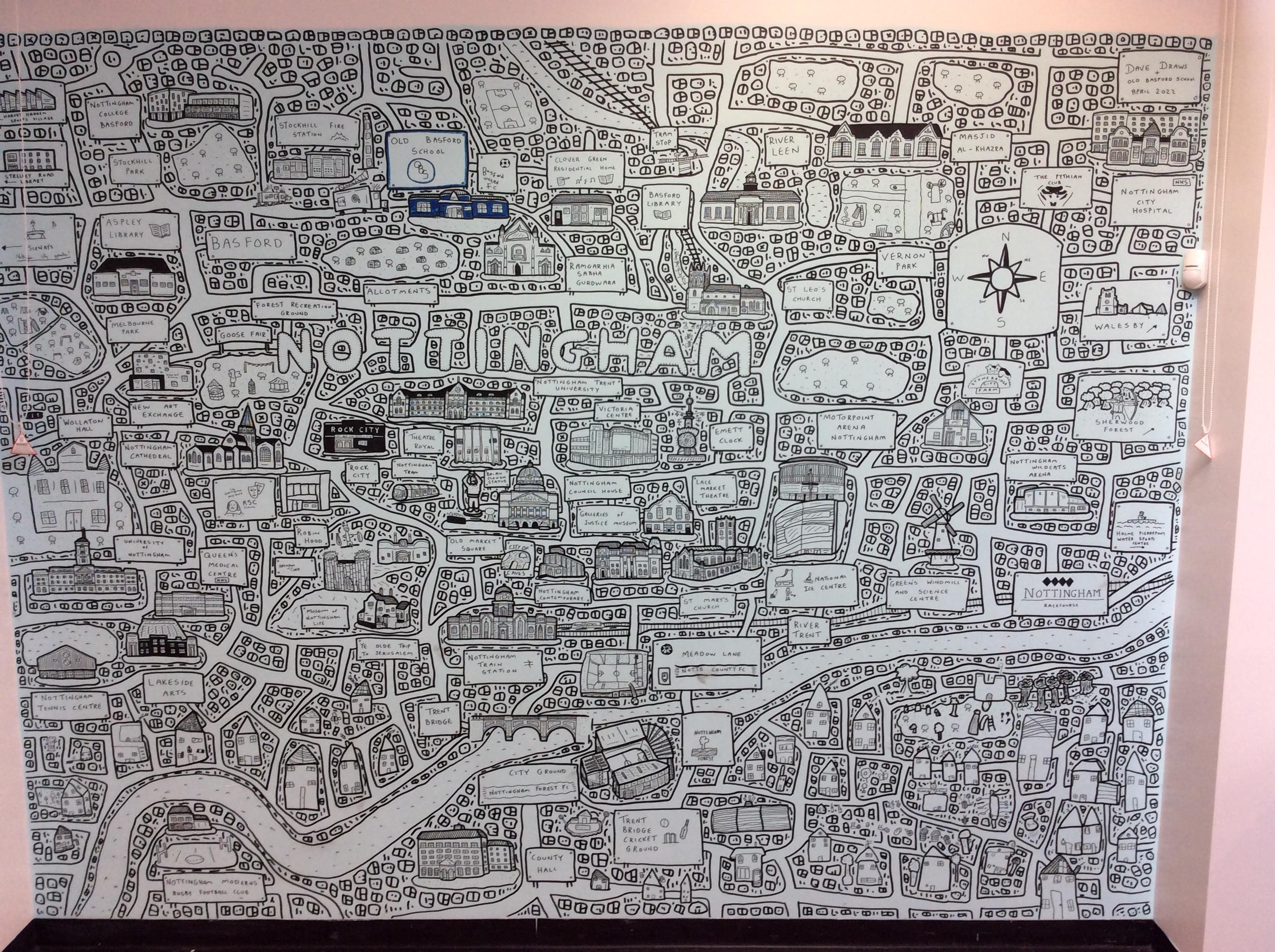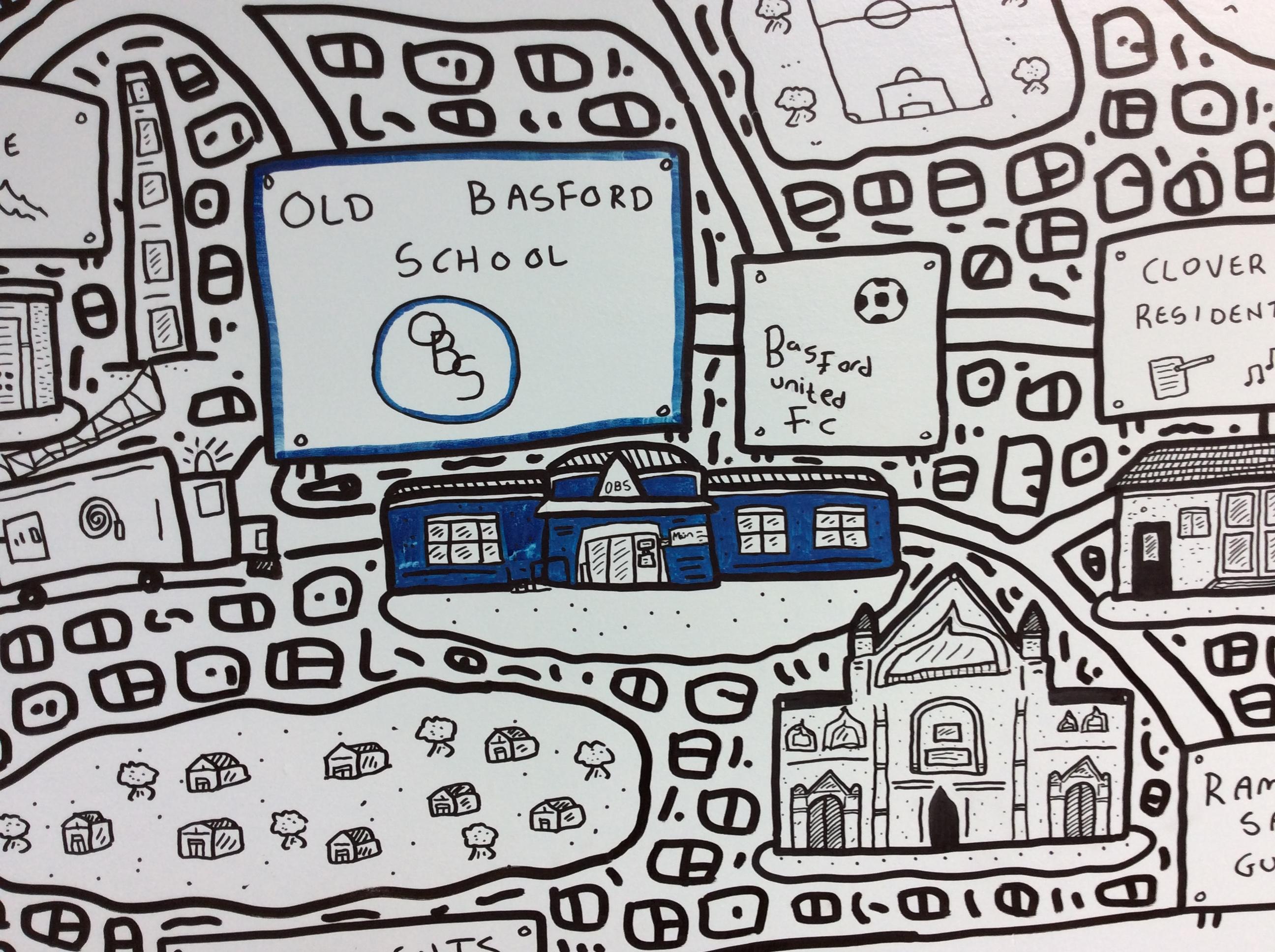 We were lucky enough to have an artist 'Dave' come to OBS and complete a fantastic mural of Nottingham and the surrounding landmarks in our school hall. The art work was created using children's ideas of which places should be included. Lots of children also got to work with Dave in creating the art.
