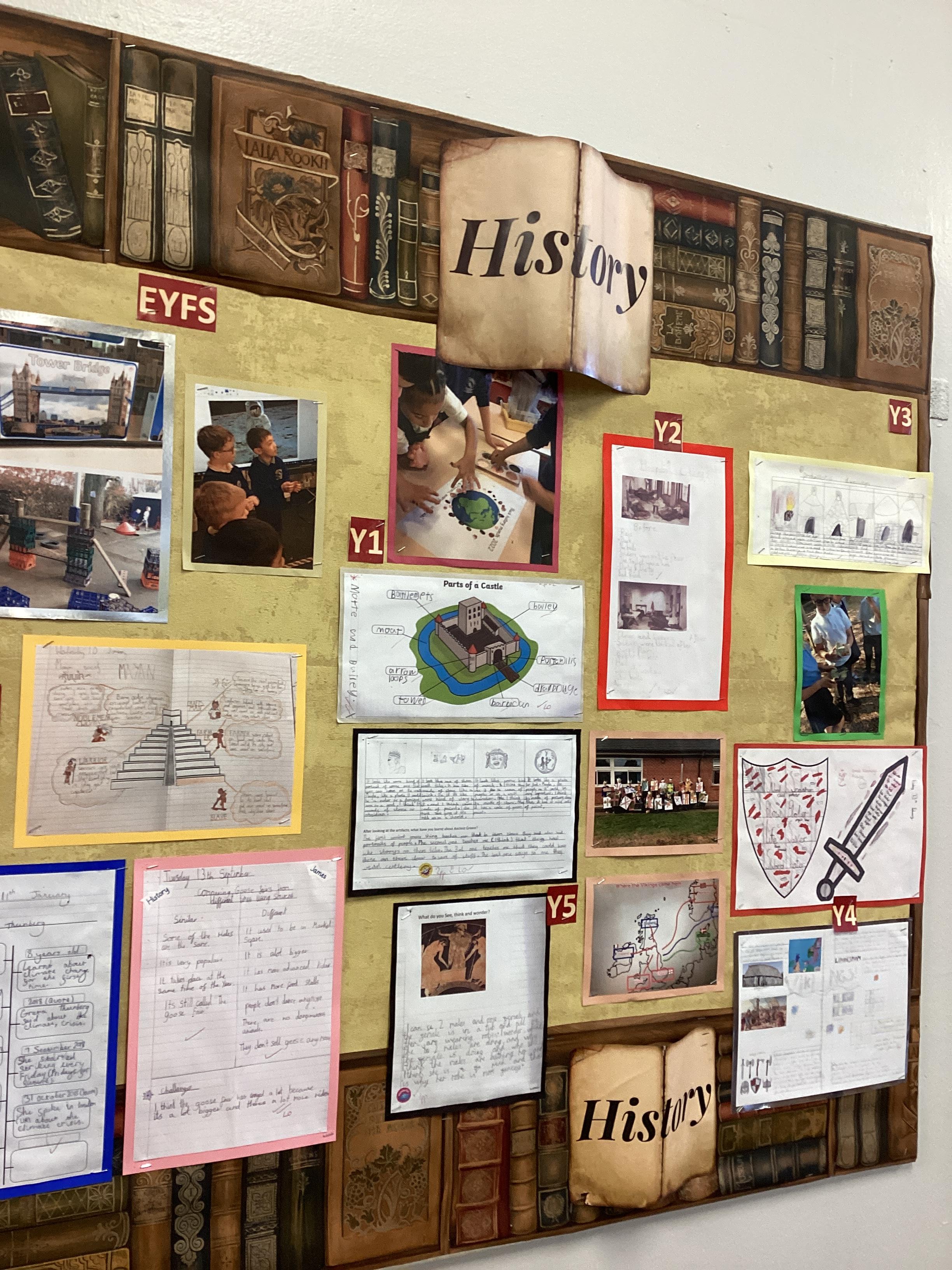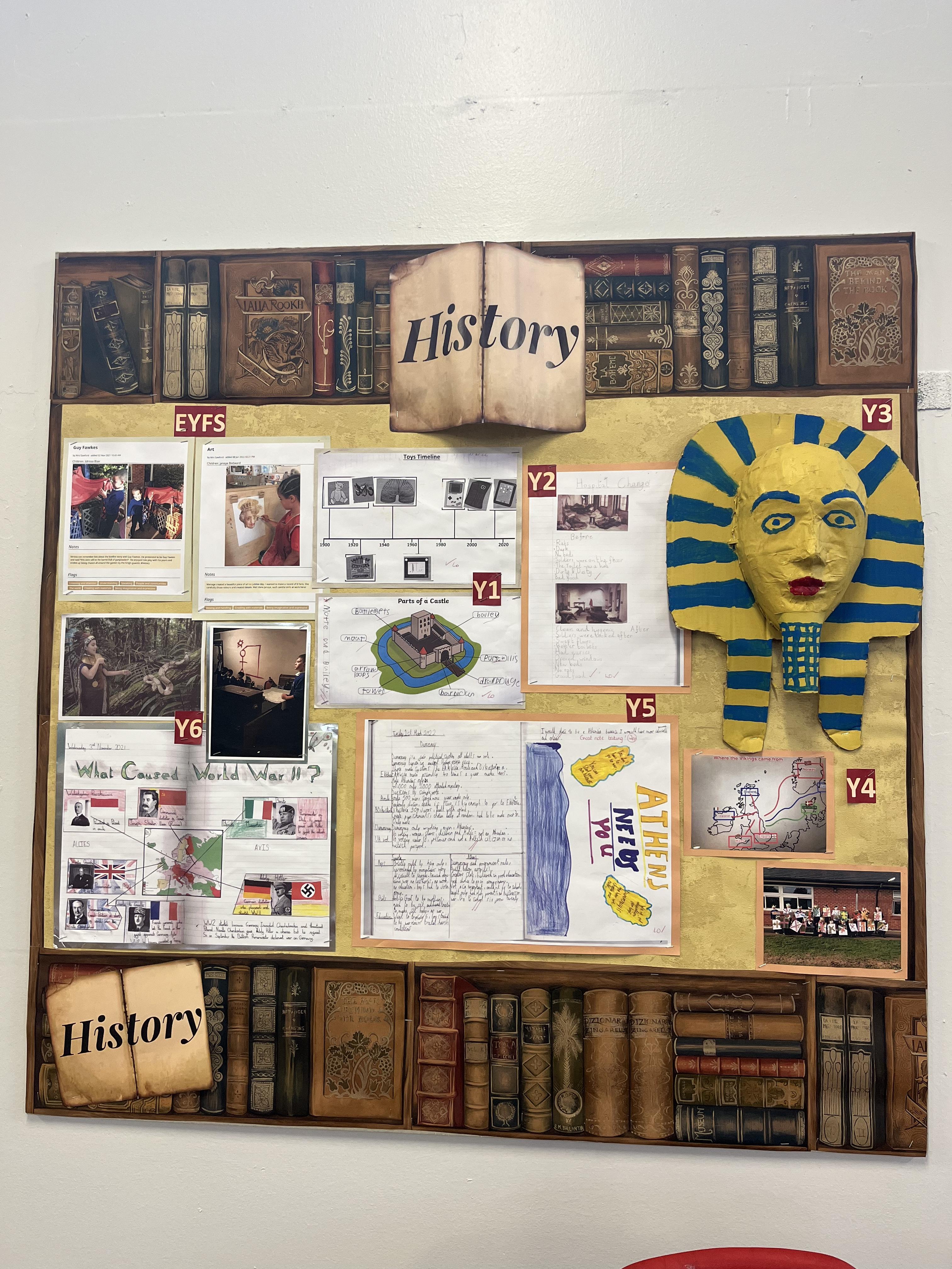 In EYFS, we teach History through the Early Learning Goal of: Understanding of the World (Past and Present). This involves talking about the lives of people and their roles in society, knowing some similarities and differences between things in the past and now and understanding the past through books read in class. We then follow the National Curriculum in Years 1 to Year 6. We have adapted the NC in to the Old Basford Curriculum Progression map and aligned this with the OBS creative topic based approach to learning. The units of learning are age appropriate and progressive from EYFS to KS2, the five main subject specific skills that bind the History curriculum together are: Chronological understanding, range and depth of historical knowledge, interpretations of history, historical enquiry and organisation and communication for which I have produced exemplification documents. Each History topic has four key knowledge based themes that run through the school: empire/ democracy/ everyday life/ technology. At the beginning of each lesson, key concepts and subject specific vocabulary are revisited and built upon. In addition, the learning objectives linked to knowledge and skills are shared explicitly to the children.