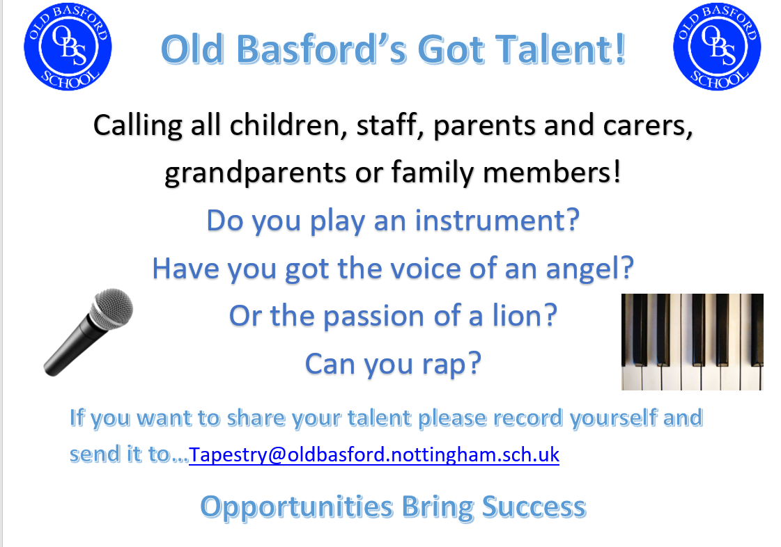 If you want to share your talent please record yourself and send it to…Tapestry@oldbasford.nottingham.sch.uk