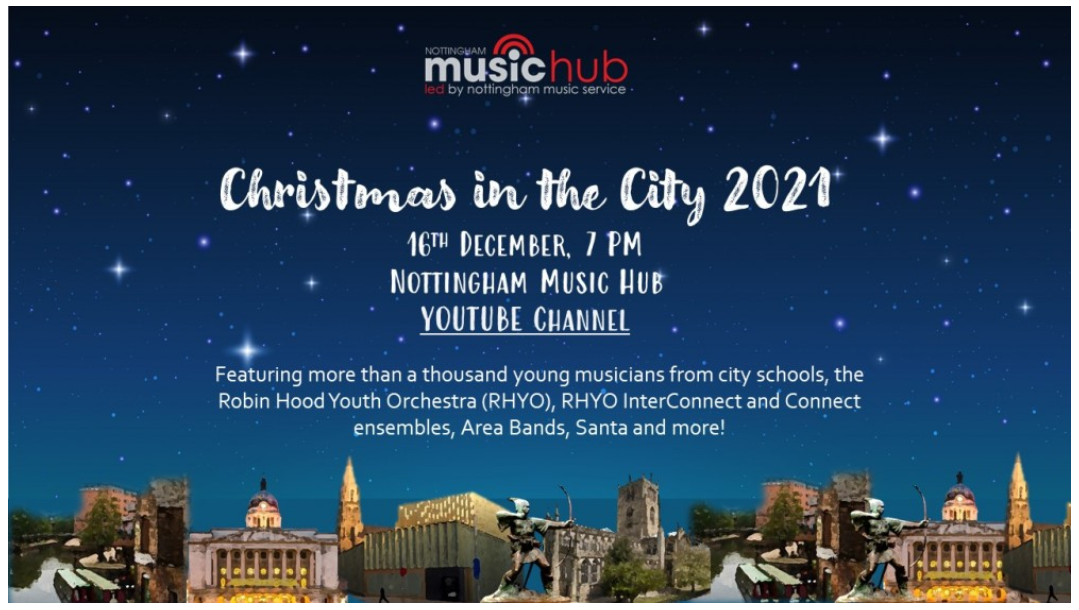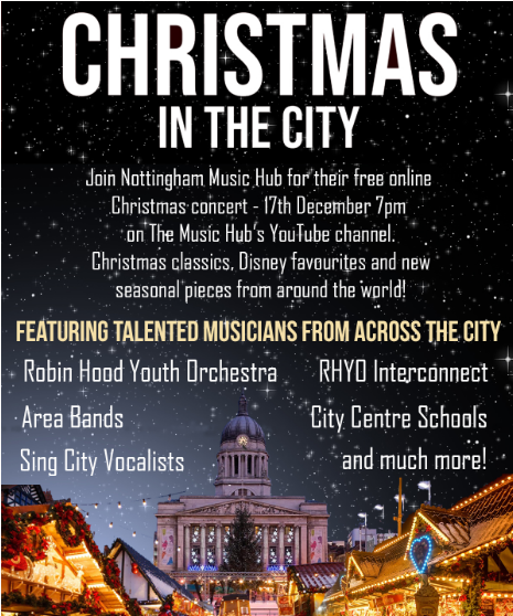 After much deliberation, Nottingham Music Hub has decided to host Christmas in the City 2021 as an online event again this year. The concert will premier on 16th December 2021, 7 PM, on our YouTube Channel so save the date and get your hot chocolate and cosy cardigans ready!