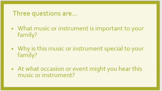 We would like you to interview a friend or a relative, and ask them about any particular musical pieces/songs or instruments that hold special value in their culture. And if you, your friends or family can play/sing this music, we would LOVE to hear it!