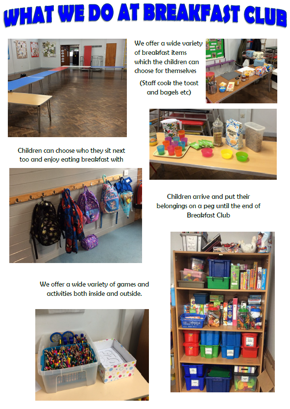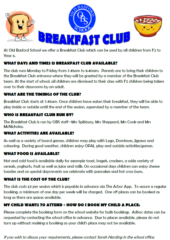 Should you require a last minute place at the Breakfast Club, please contact the school office before 4.15pm. Please do not turn up without making a booking as your child's place cannot be guaranteed.