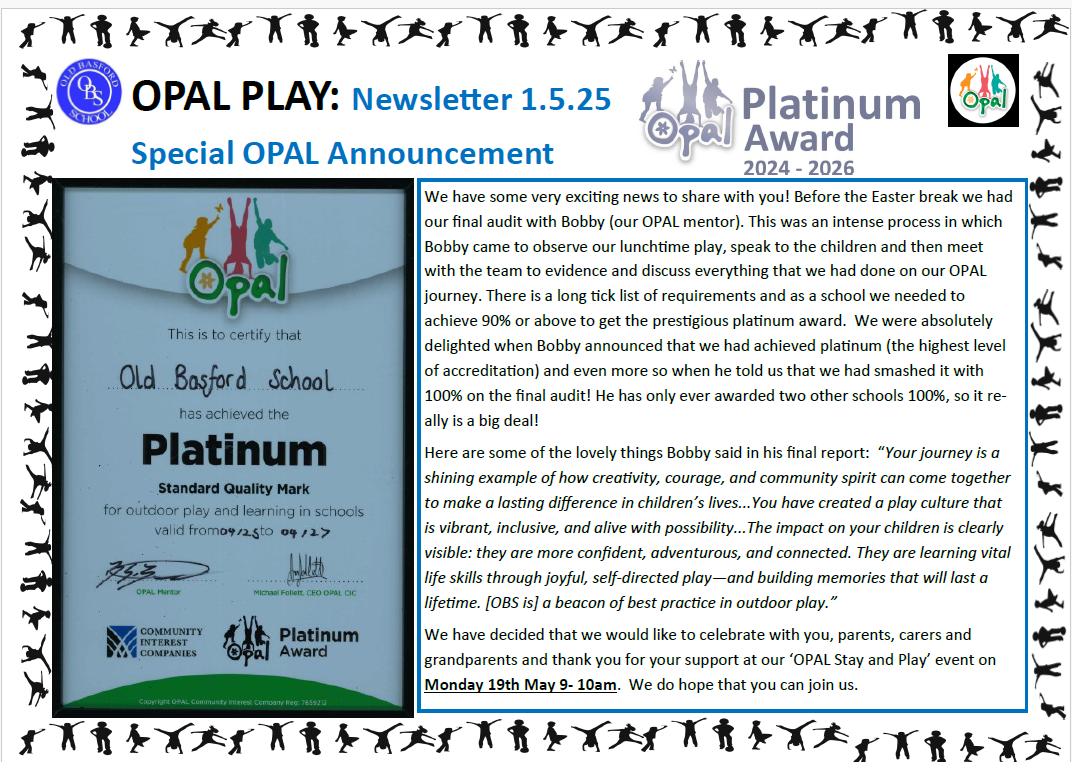We are absolutely delighted as a school to share with you that we are officially an OPAL Play school (Outdoor Play and Learning). Our journey with OPAL started in September 2023 and we have gone from strength to strength ever since and we were recently awarded 'Platinum status' which is the highest OPAL accreditation. Please see the letter from Bobby, our mentor, which is full of high praise.