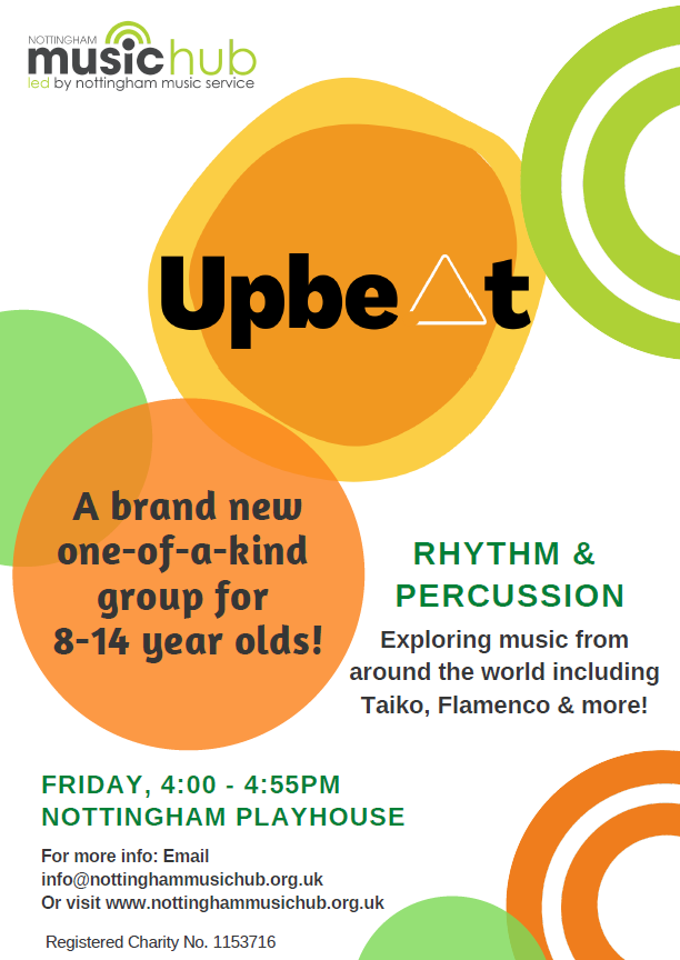 Our new Upbe^t ensemble is for City pupils ages 8 and above and guess what, you don't even need to have a musical instrument! This exciting group will learn everything from Taiko drumming to stomp type drumming, body percussion from other cultures and other creative ways of using everyday objects as musical instruments! They will meet once a week on Fridays from 4:00 PM to 4:55 PM at Nottingham Playhouse. Any Old Basford School pupils who are interested to email info@nottinghammusichub.org.uk for more information!