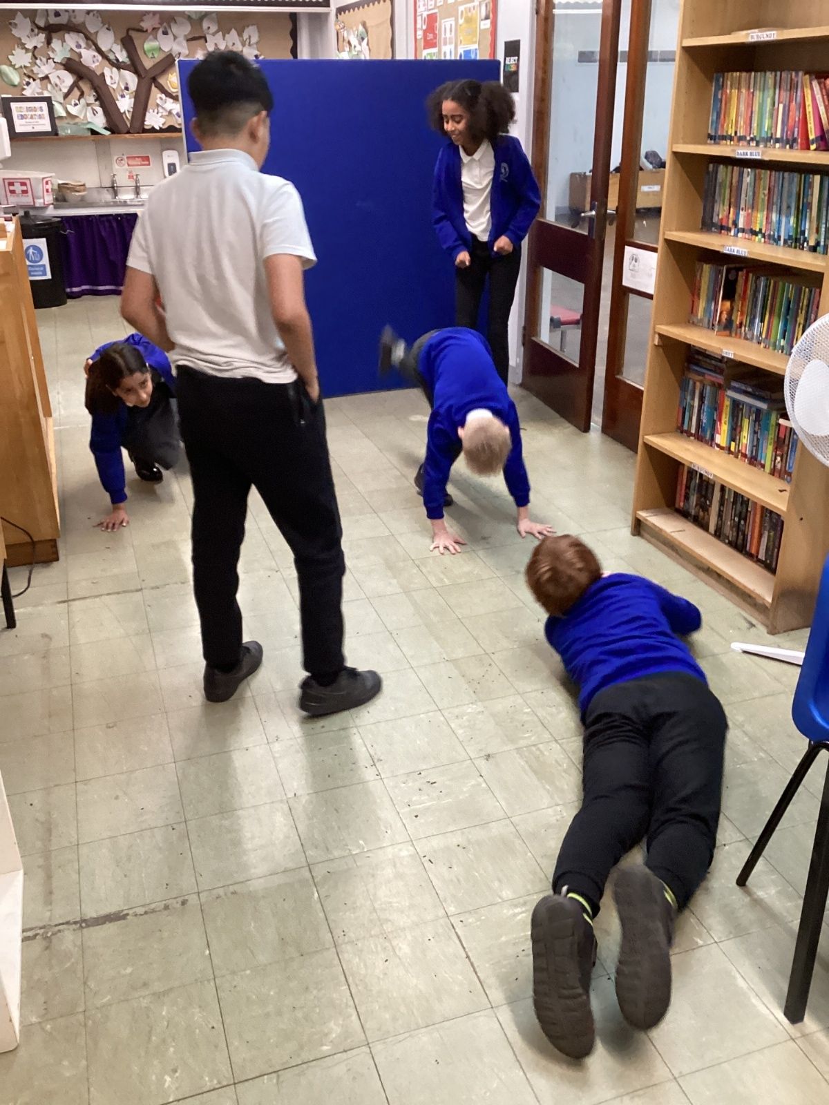 In our indoor PE session this week, we continued with our circuit training to improve our overall health and fitness. We worked in pairs and moved round a variety of stations completing each activity for one minute. This is our second week on our circuits unit so we were trying to beat our scores from last week. The activities included burpees, sit ups, tricep dips, the plank, star jumps and many more!