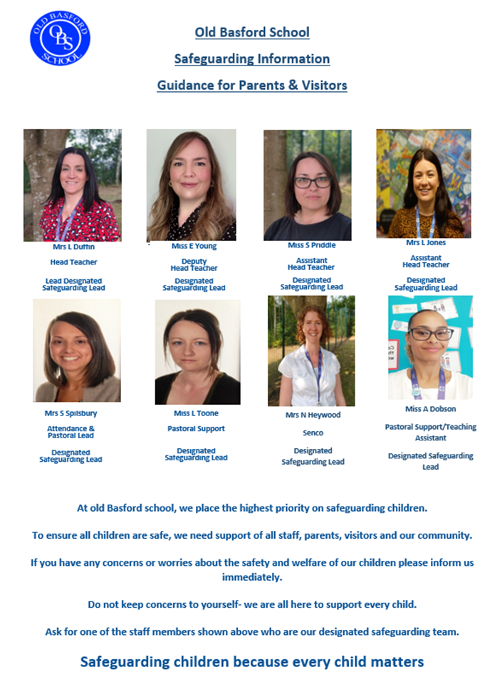 Old Basford School has a duty of care to all pupils. As staff, we collectively work hard to protect children from harm and to safeguard their wellbeing. Everyone at Old Basford School is jointly responsible for safeguarding, but we do have a dedicated team of trained Safeguarding Leads: