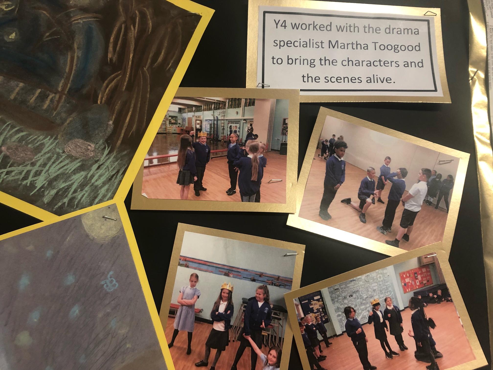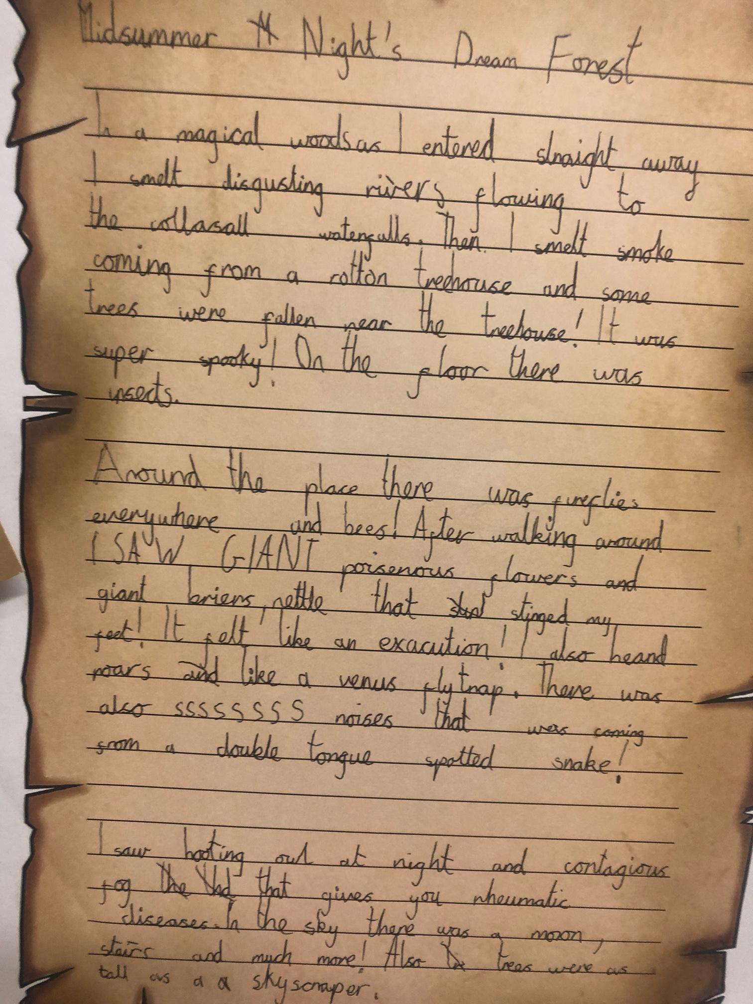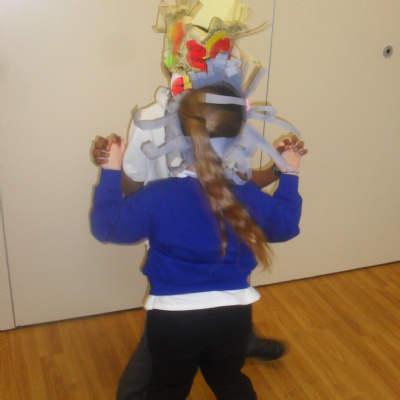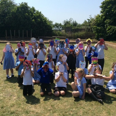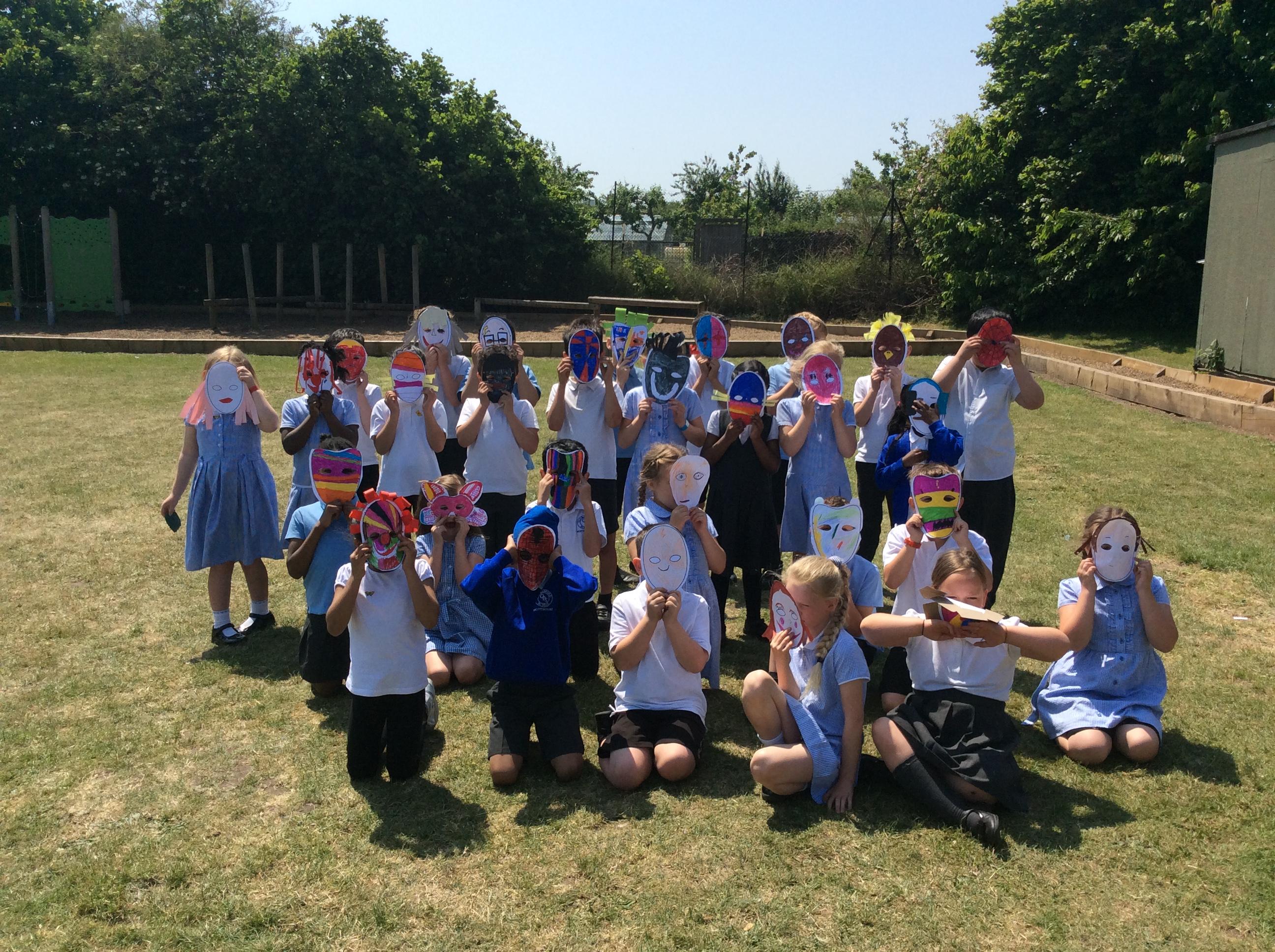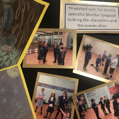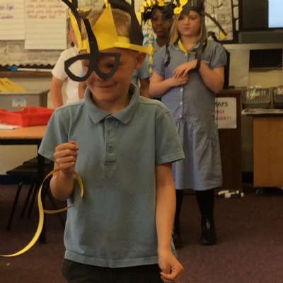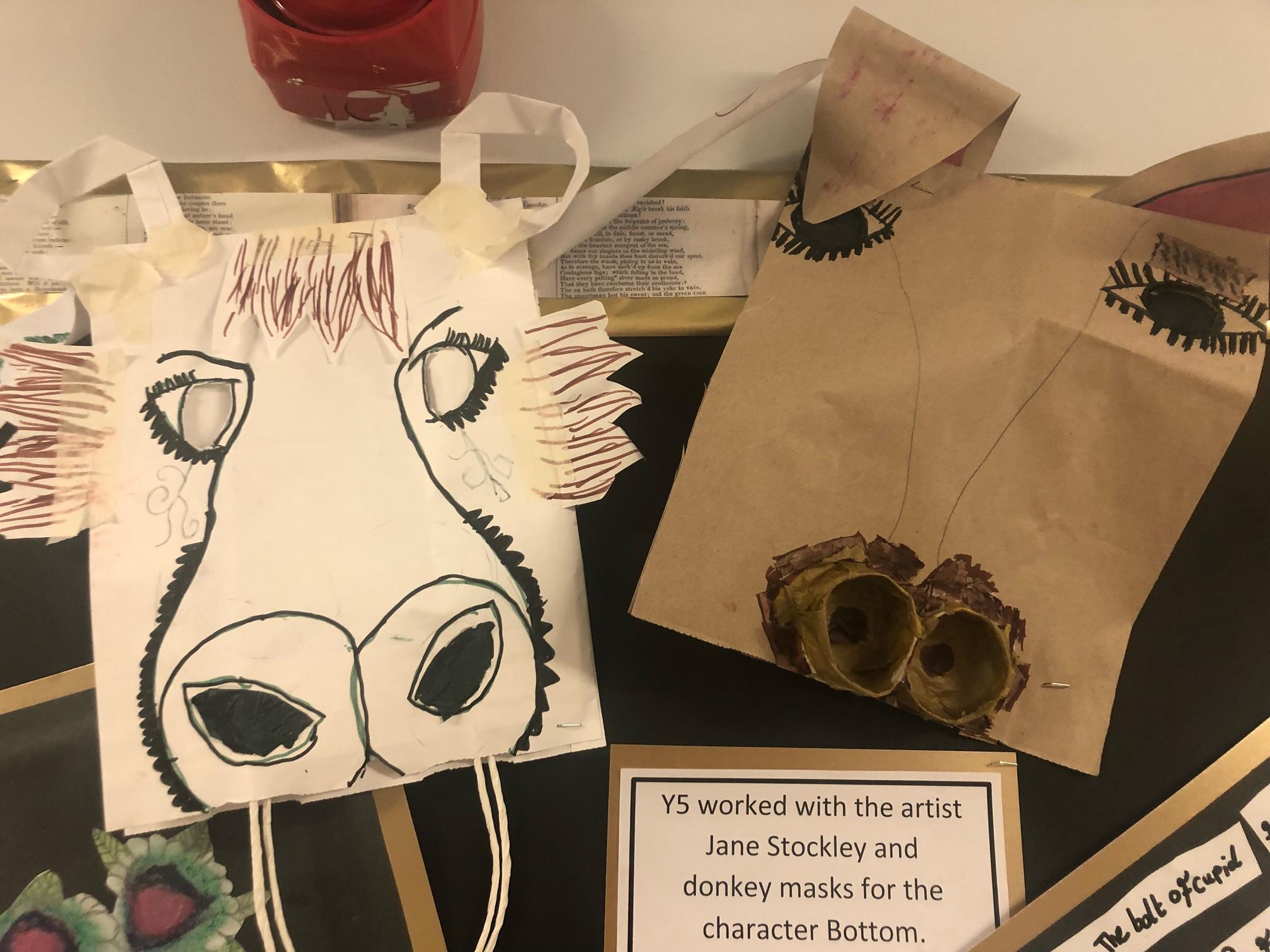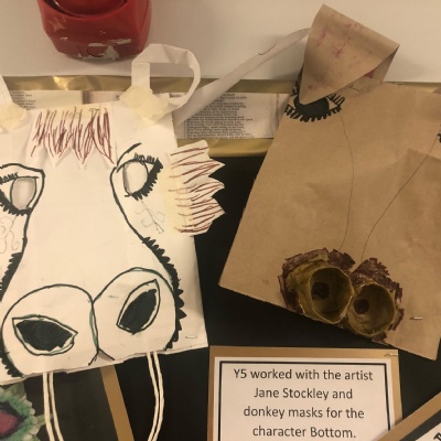 The Year 2 and the Year 4 children were lucky to work with Martha Toogood, a drama specialist, who helped them to understand the characters and the setting of the play through drama techniques using words and phrases from the original text. Year 5 were fortunate to work with the artist Jane Stockley on a project of making props for the play, namely a donkey's head for the character Bottom. Year 6 had the exciting opportunity of writing lyrics, singing and recording their own song about the play under the expert direction of the musician Liam Malloy.
