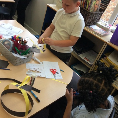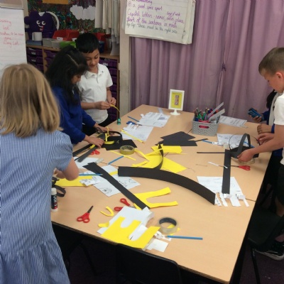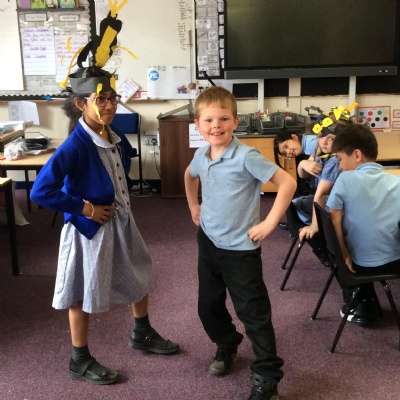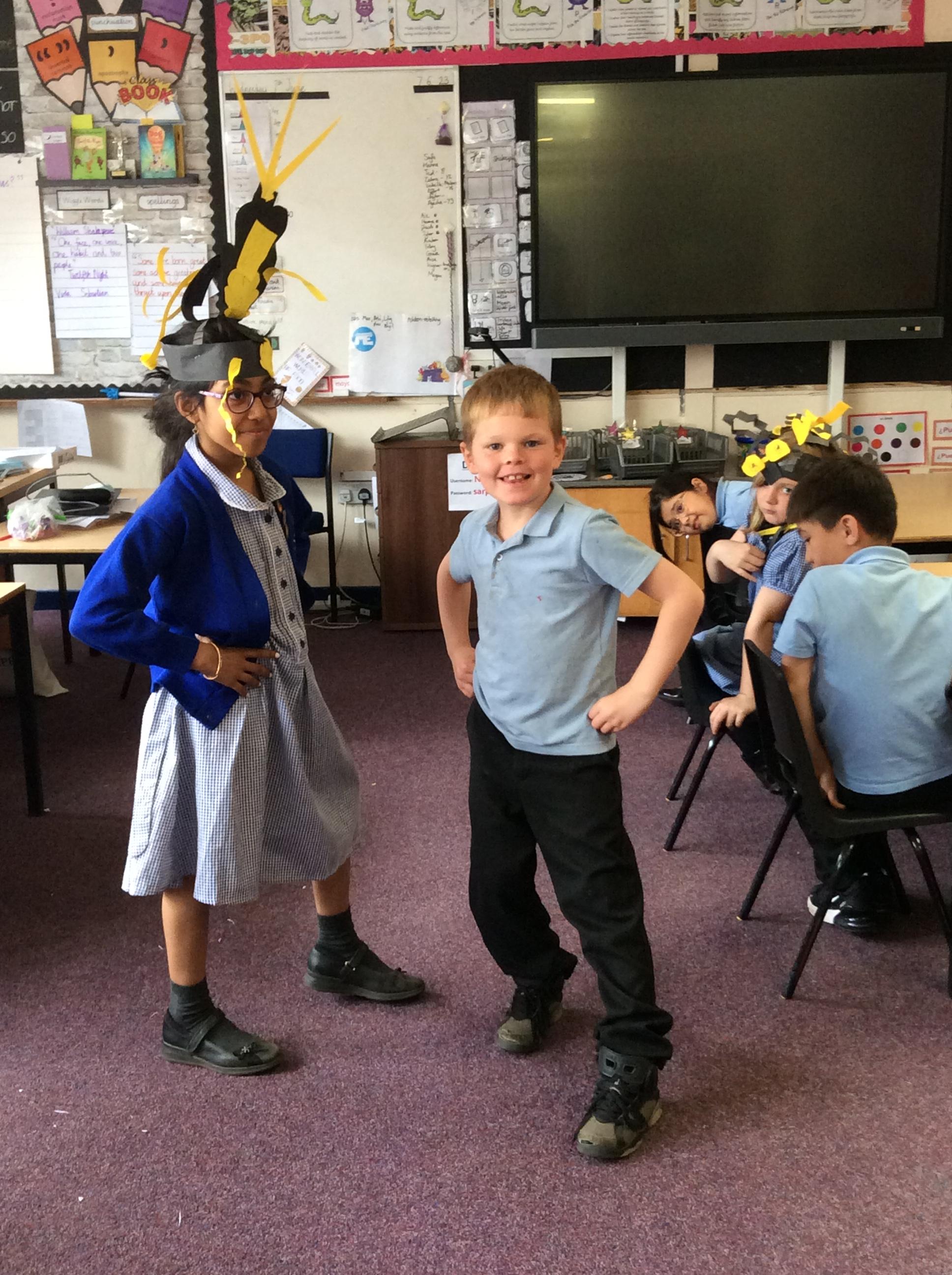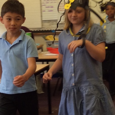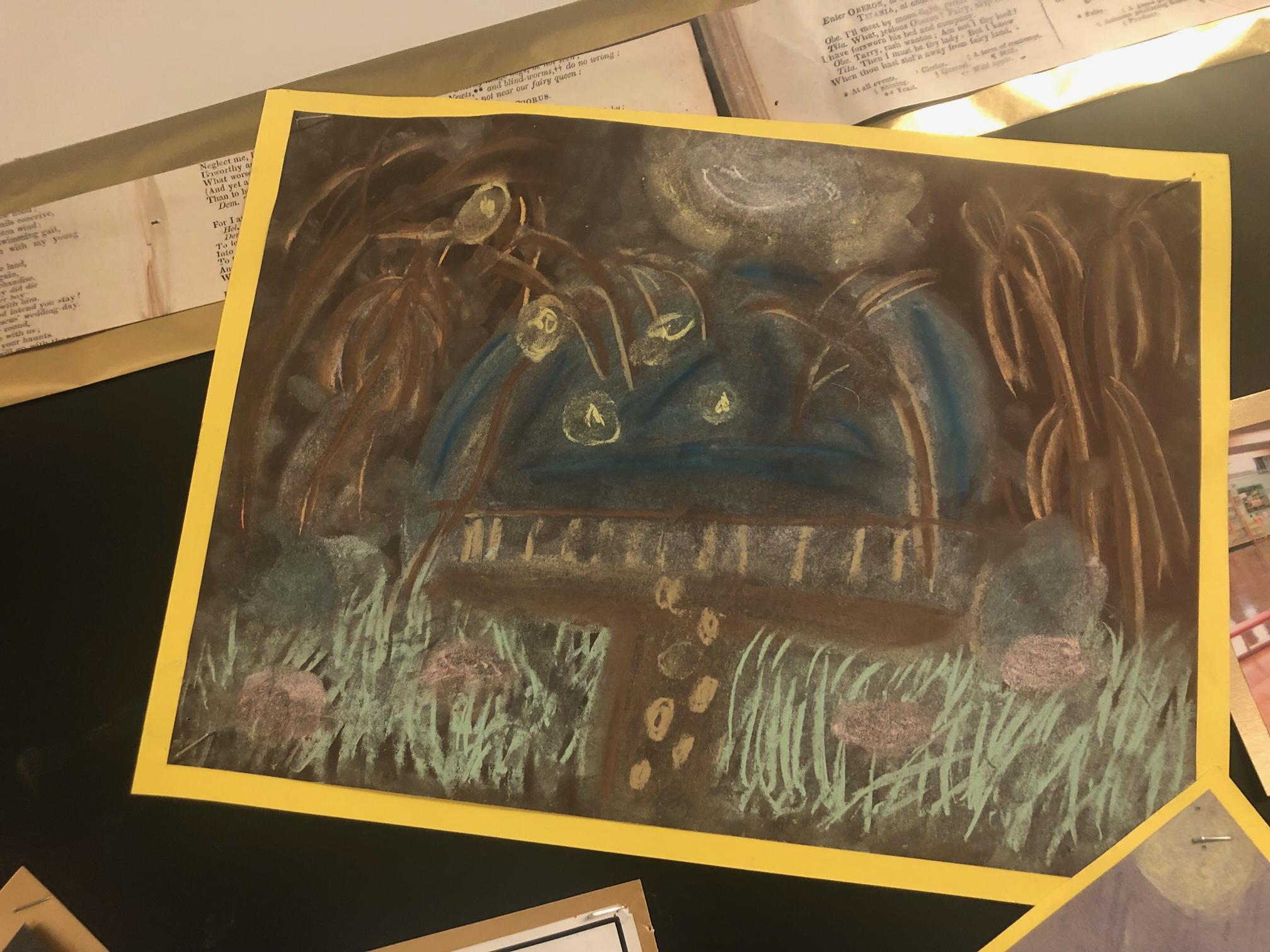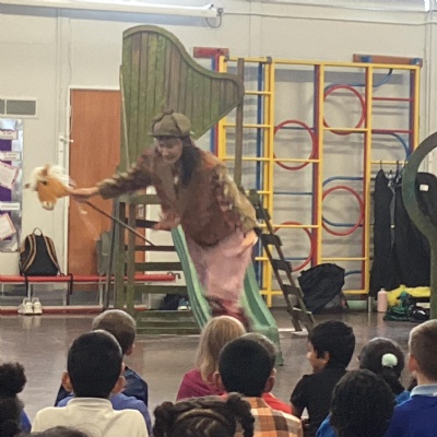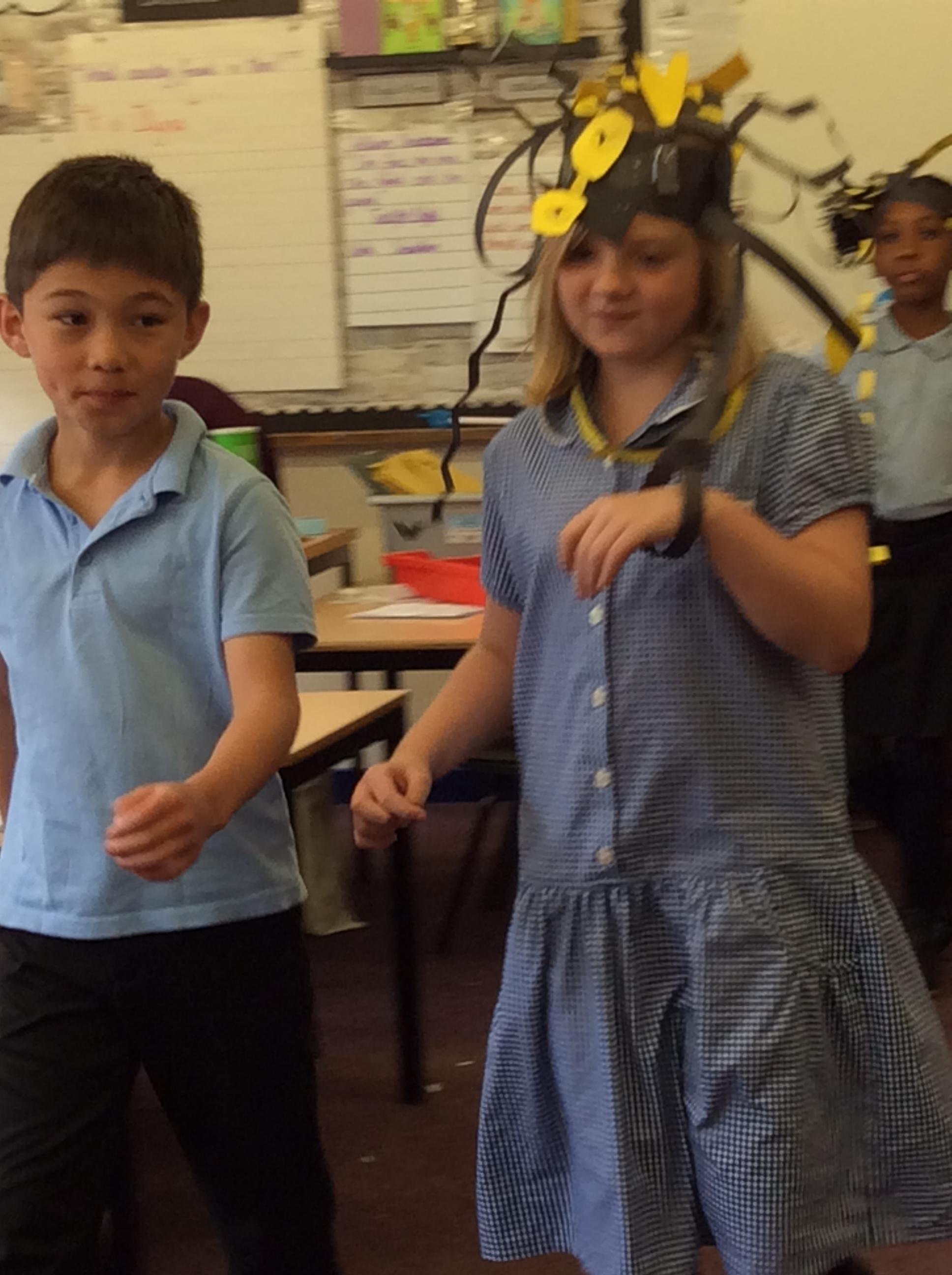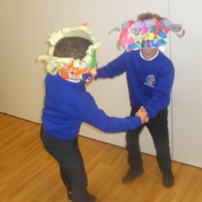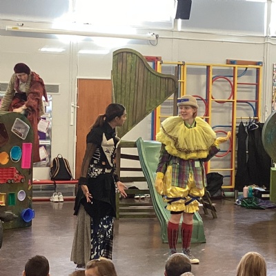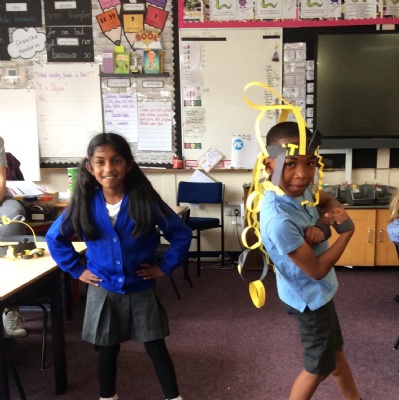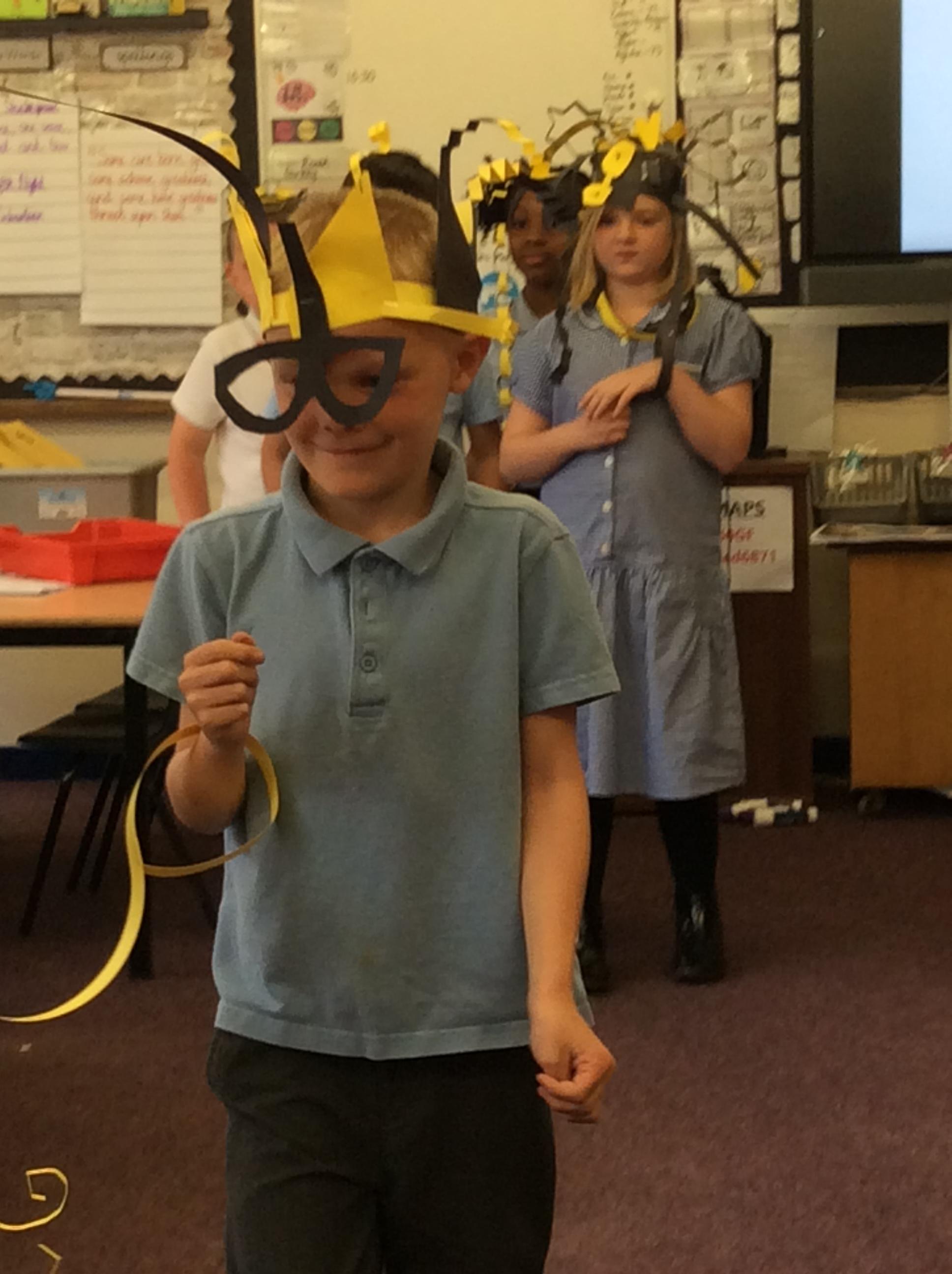 The Year 2 and the Year 4 children were lucky to work with Martha Toogood, a drama specialist, who helped them to understand the characters and the setting of the play through drama techniques using words and phrases from the original text. Year 5 were fortunate to work with the artist Jane Stockley on a project of making props for the play, namely a donkey's head for the character Bottom. Year 6 had the exciting opportunity of writing lyrics, singing and recording their own song about the play under the expert direction of the musician Liam Malloy.