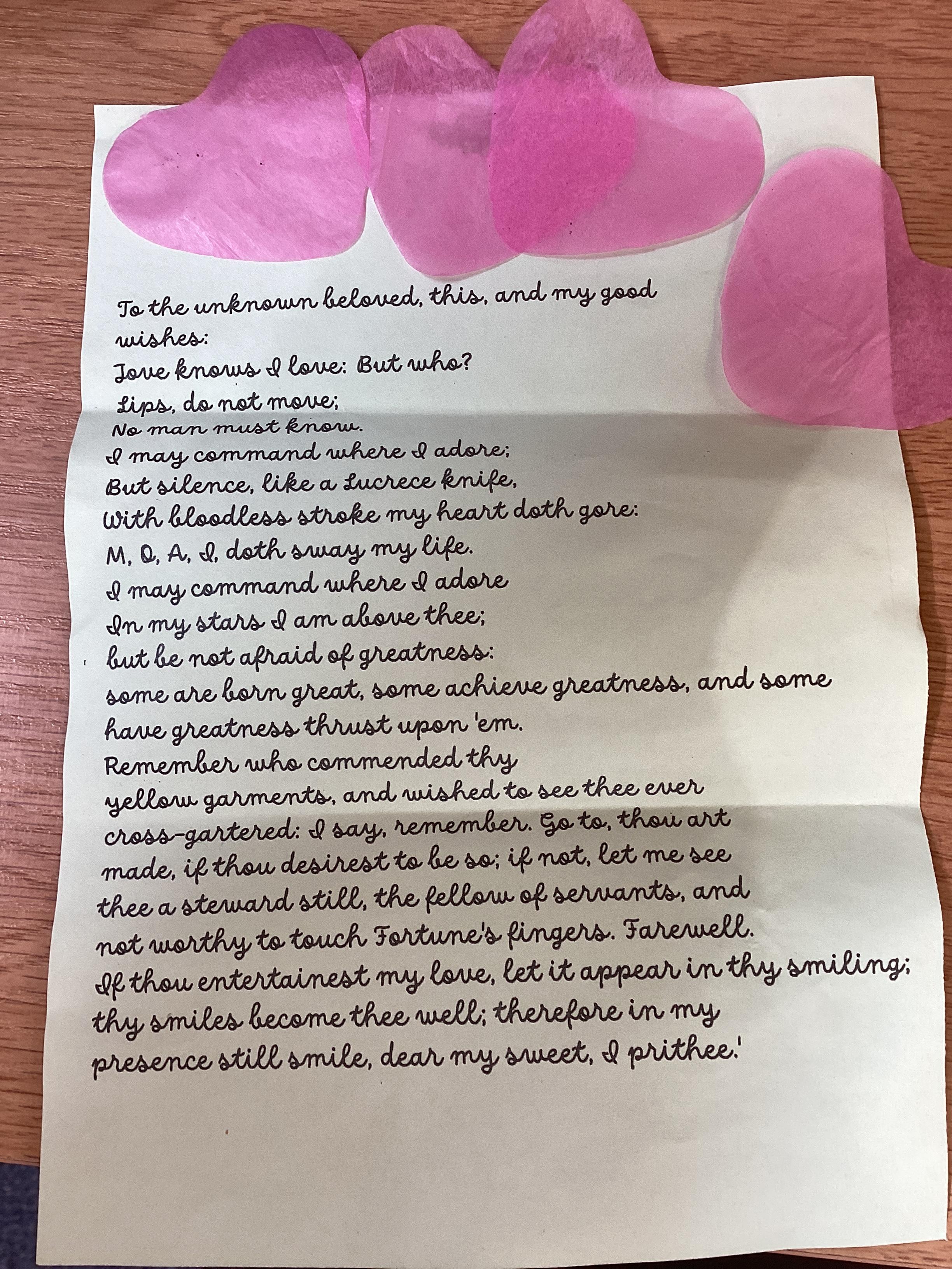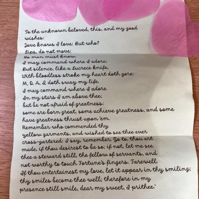 Nottingham Playhouse came to OBS on Monday 17th July to perform an abridged version of our current Shakespeare text of "Twelfth Night". There was a cast of just 4 actors but they amazingly performed all of the different characters in the play. The children loved being able to change for Cesario and Sir Toby during their duel and really enjoyed singing a love song to Olivia. The play was hilarious in parts and the actors made the play so engaging for such a young audience whilst sticking to the original text. What an absolute treat! When the actors left we found the love letter to Malvolio from Maria pretending to be Olivia, so we have kept it alongside heart-shaped confetti as a memento!