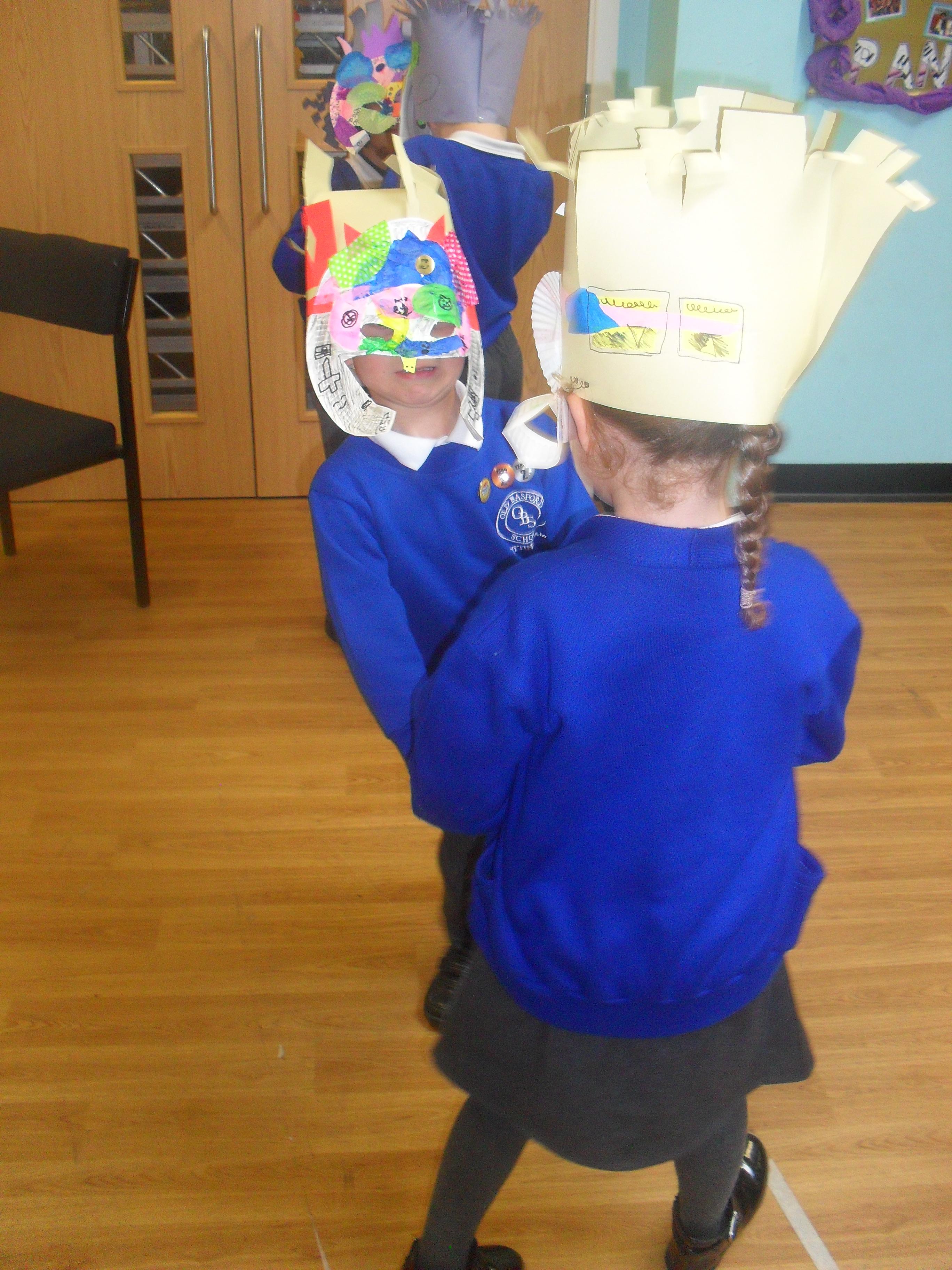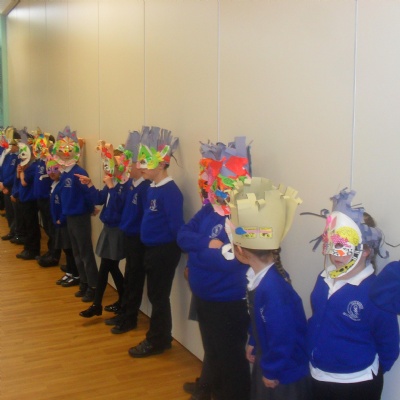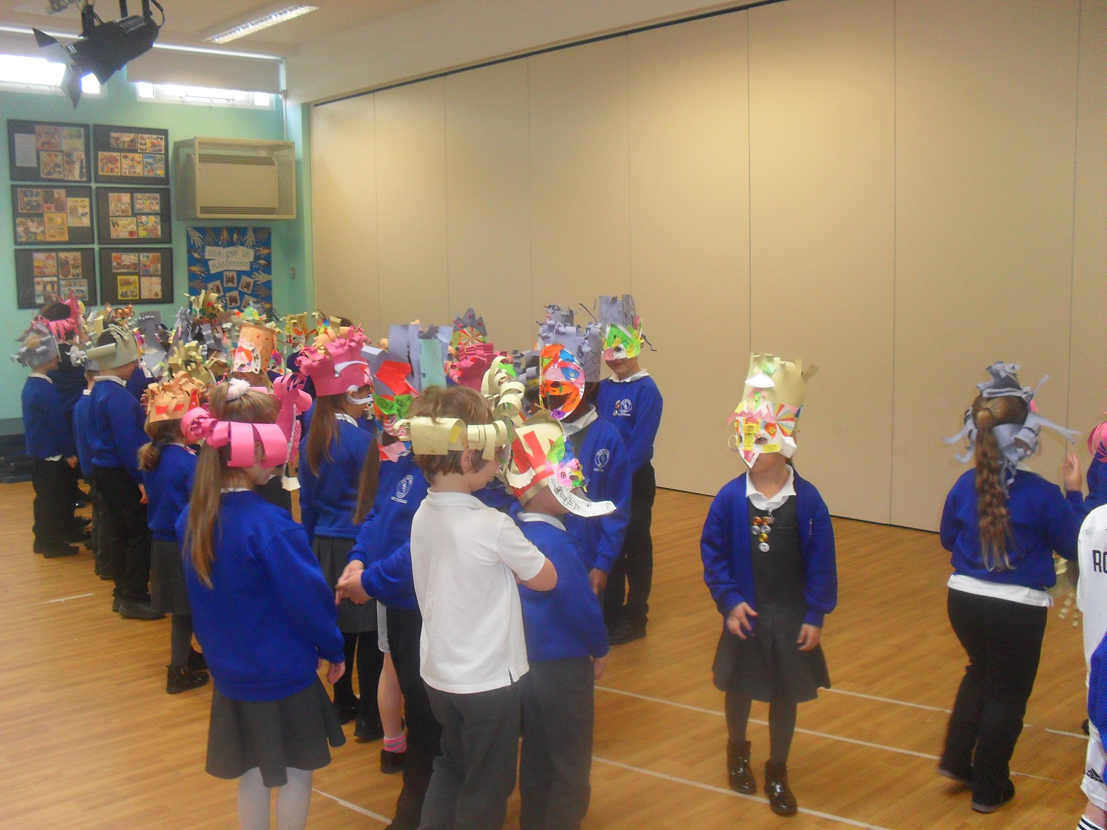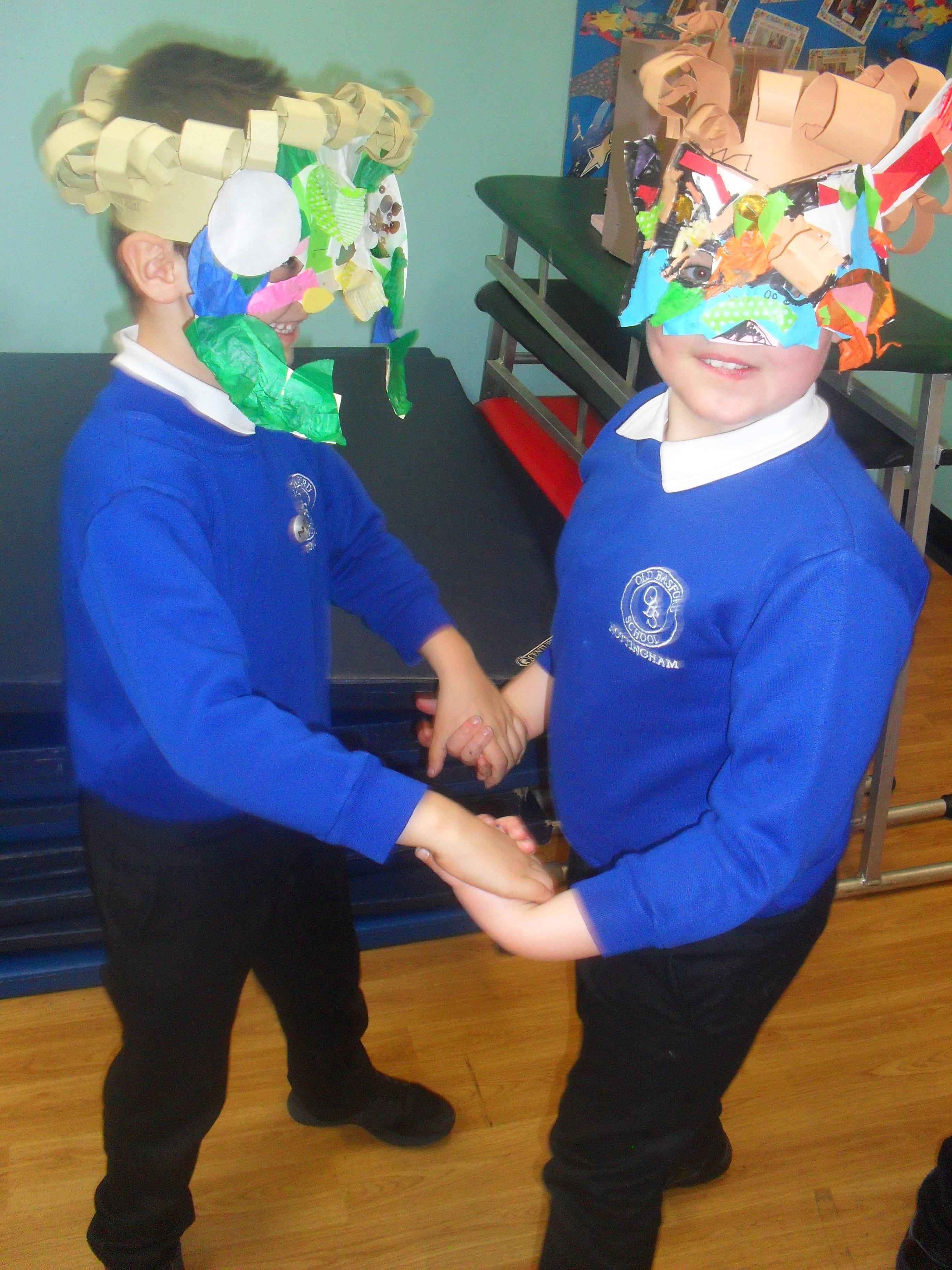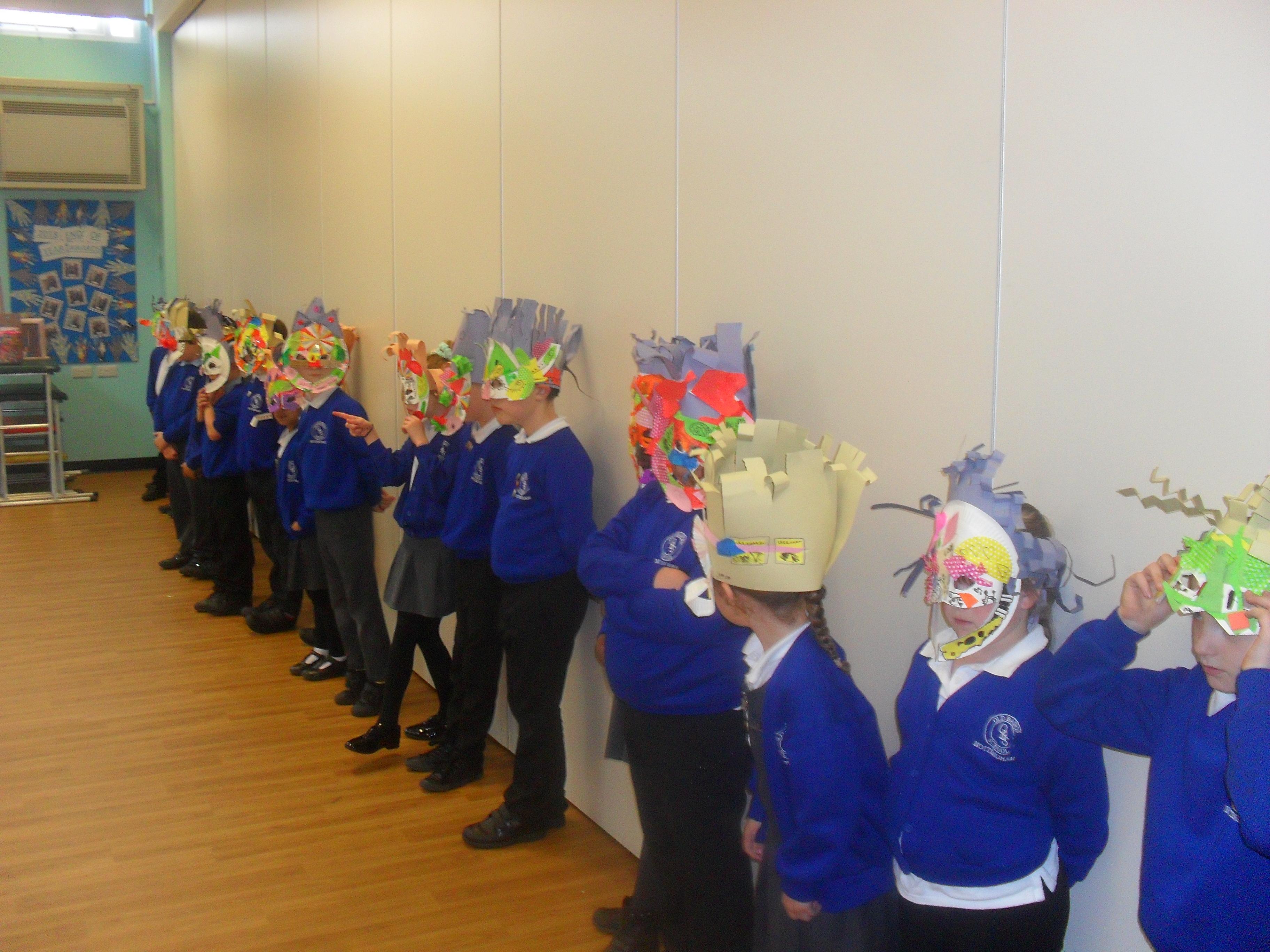 We were fortunate to work alongside an RSC associate artist, musician and dramatist. Three year groups were fortunate to have a day which each of the artists and gain from their expertise. The musician, Liam Maloy worked with the classes in F2 and taught them songs that he had specially written and got them dance along and accompany him with percussion instruments. Liam's songs are very catchy and the children quickly picked up the lyrics and could join in. They loved it! Jane Stockley, the artist, worked with the Year 2 children to create masks for the Capulet masquerade ball, which they did, in fact, wear later in the week when they re-enacted the scene. As you will see from the photographs the masks were made from paper, paper plates and some very clever cutting and folding techniques. They looked fantastic! The Year 5 children were fortunate to work Martha Toogood who worked on the children's drama techniques. The classes then used the scenes to perform in their parent achievement assembly.