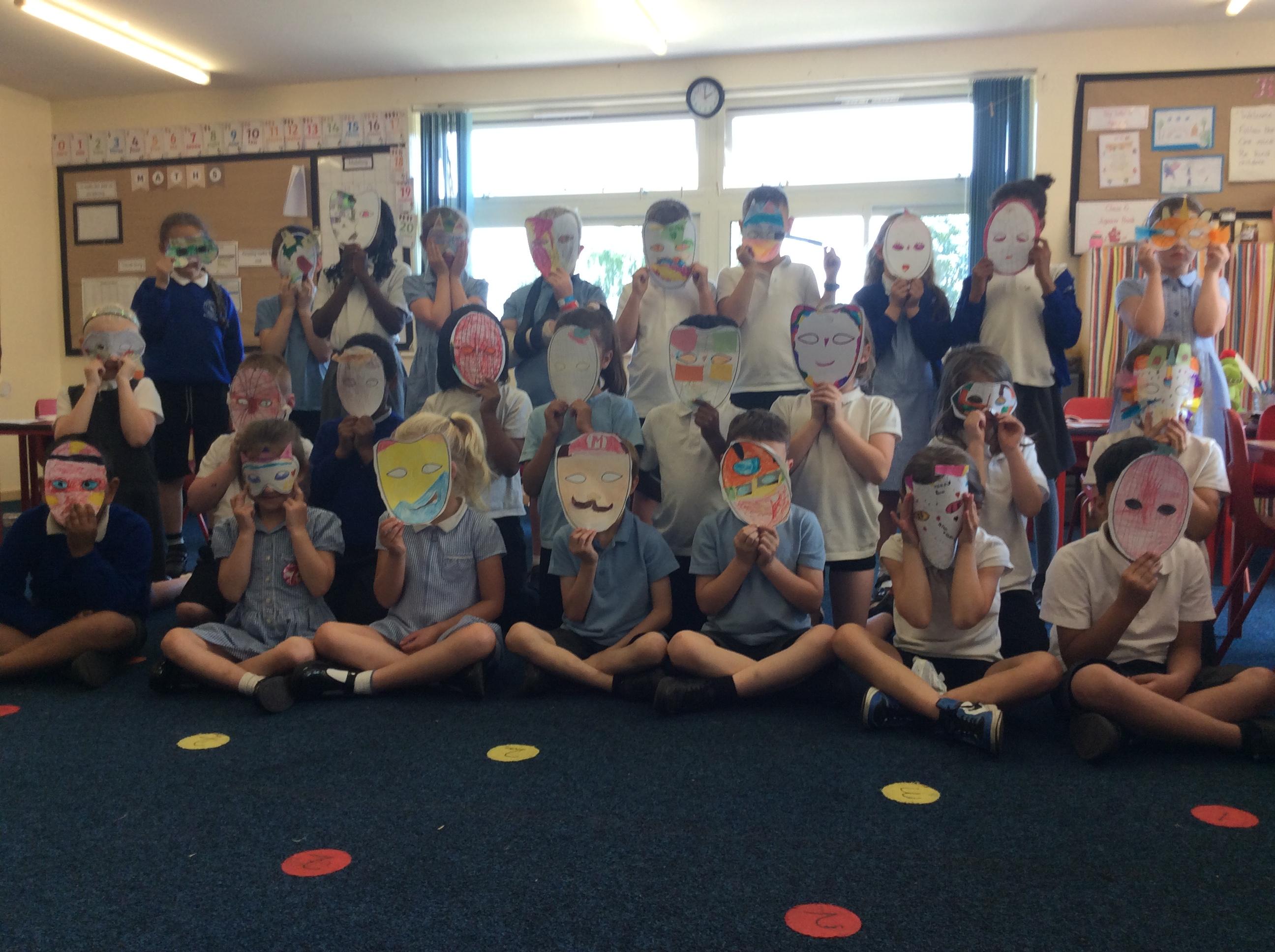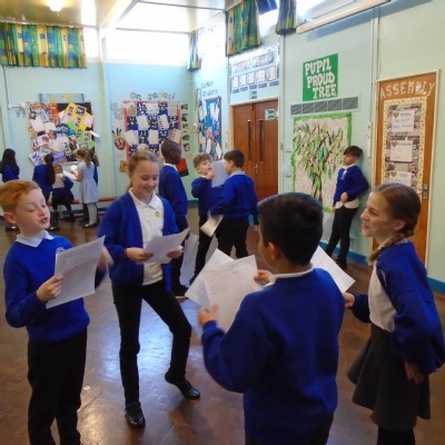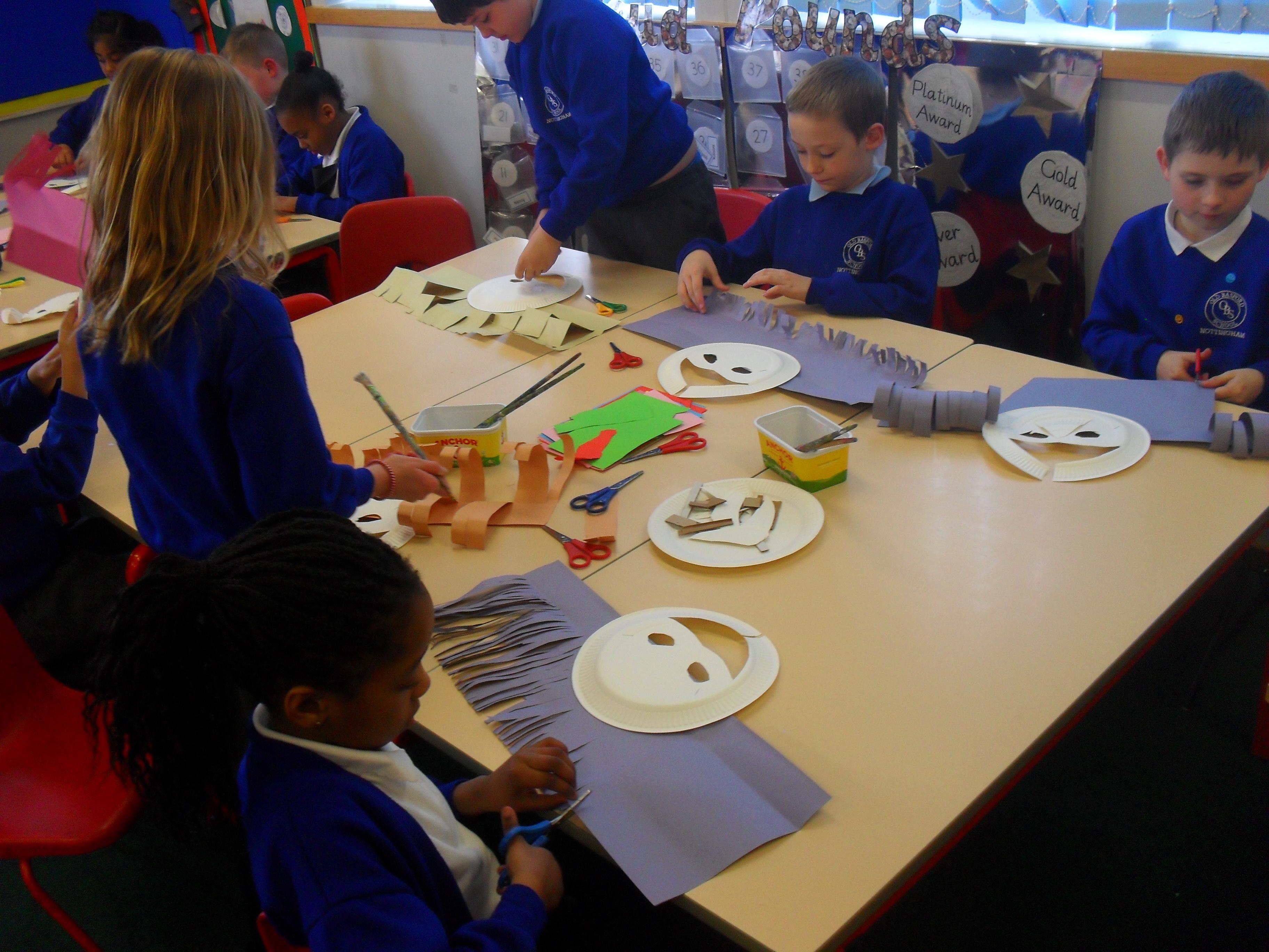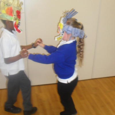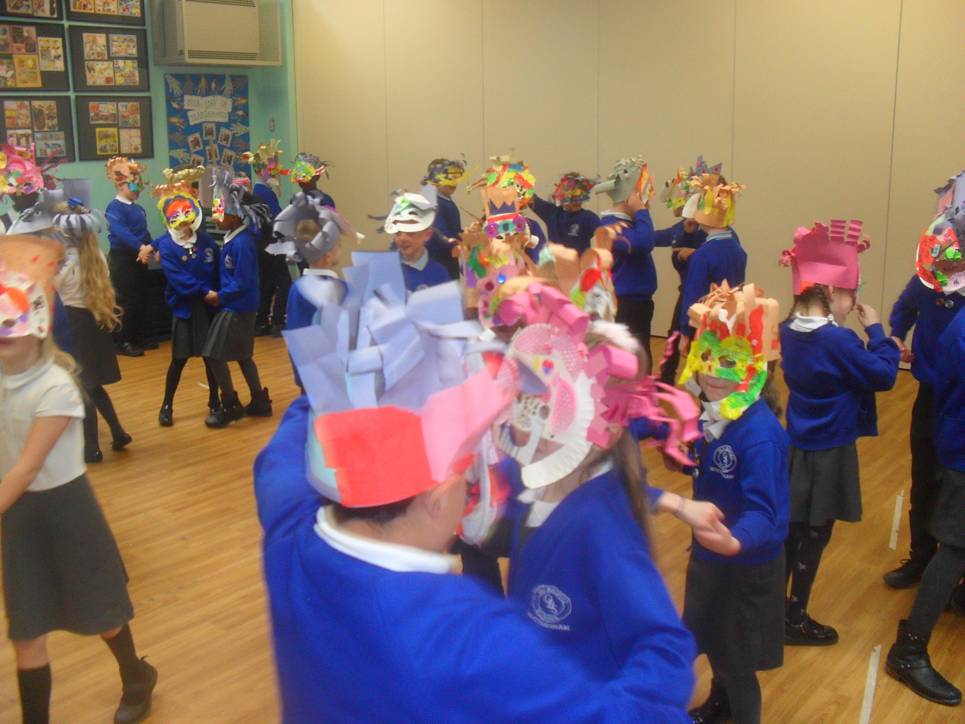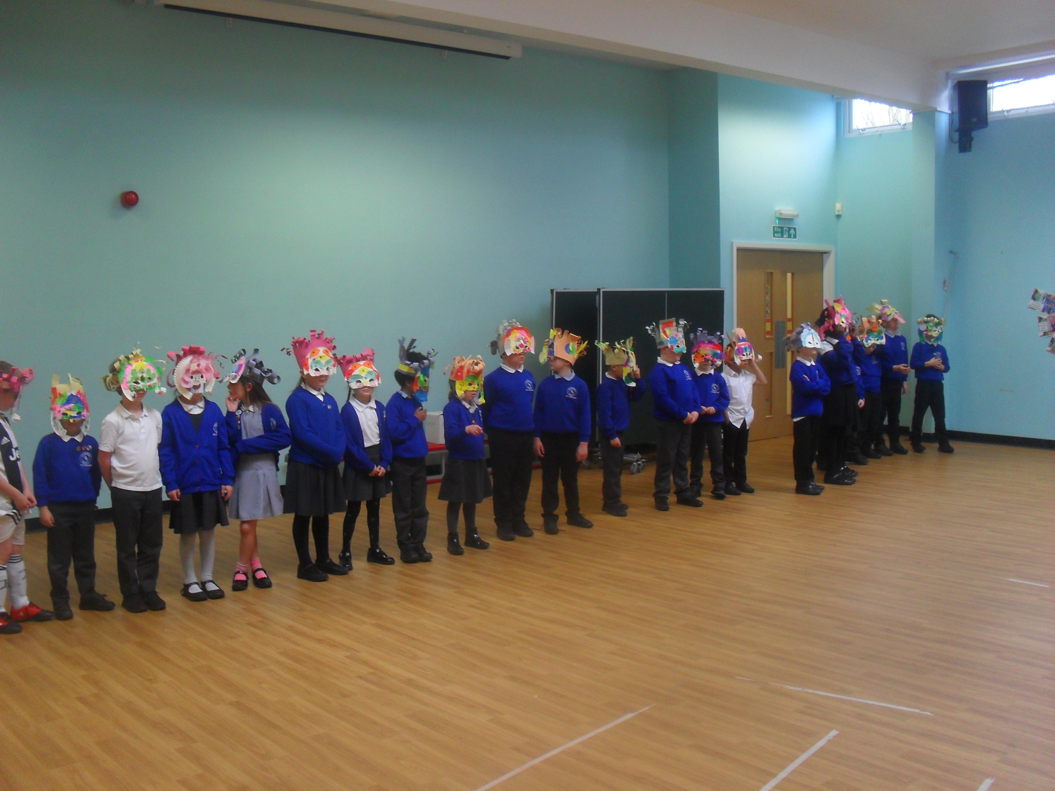 We were fortunate to work alongside an RSC associate artist, musician and dramatist. Three year groups were fortunate to have a day which each of the artists and gain from their expertise. The musician, Liam Maloy worked with the classes in F2 and taught them songs that he had specially written and got them dance along and accompany him with percussion instruments. Liam's songs are very catchy and the children quickly picked up the lyrics and could join in. They loved it! Jane Stockley, the artist, worked with the Year 2 children to create masks for the Capulet masquerade ball, which they did, in fact, wear later in the week when they re-enacted the scene. As you will see from the photographs the masks were made from paper, paper plates and some very clever cutting and folding techniques. They looked fantastic! The Year 5 children were fortunate to work Martha Toogood who worked on the children's drama techniques. The classes then used the scenes to perform in their parent achievement assembly.