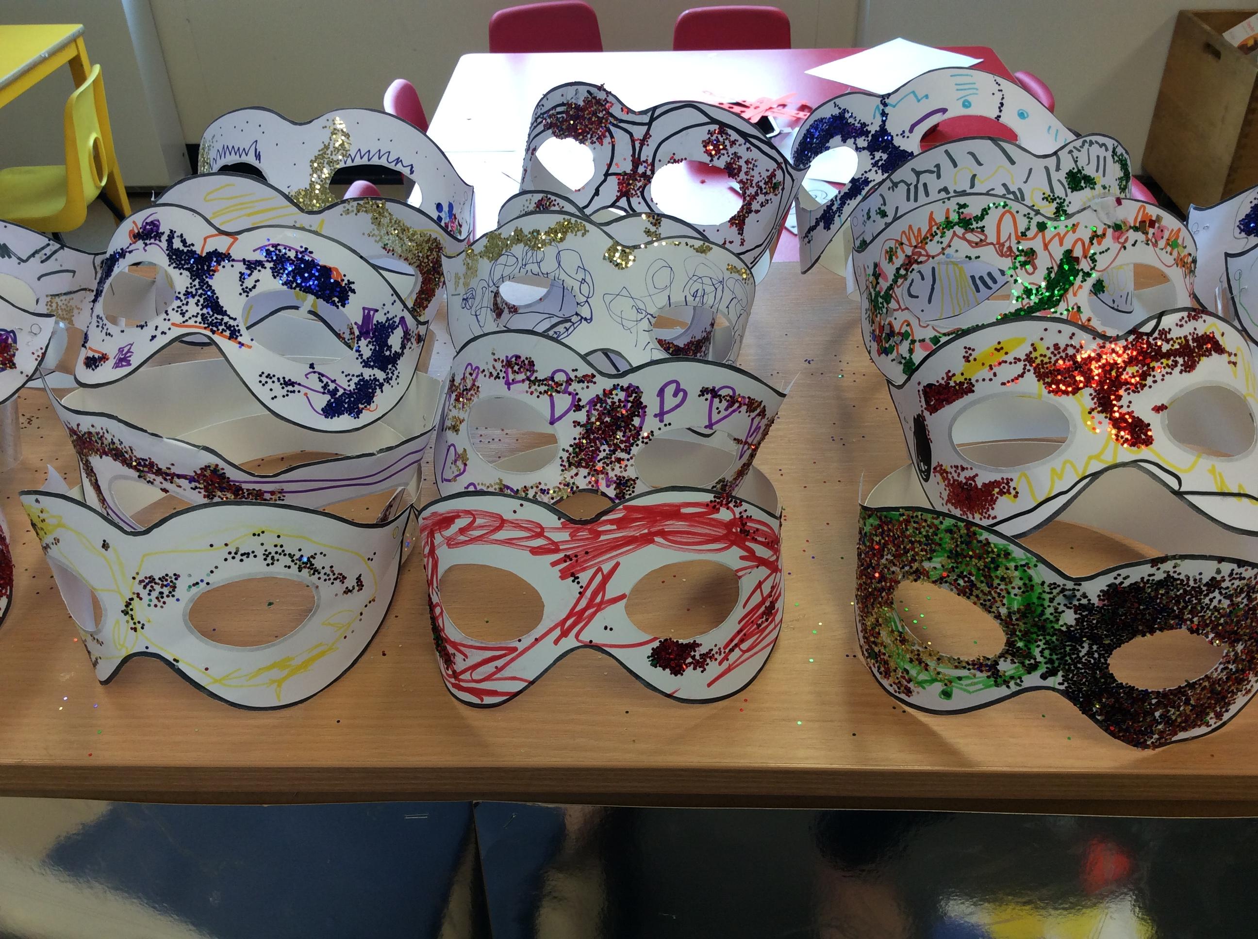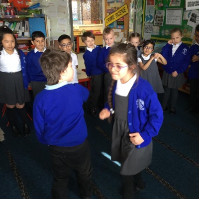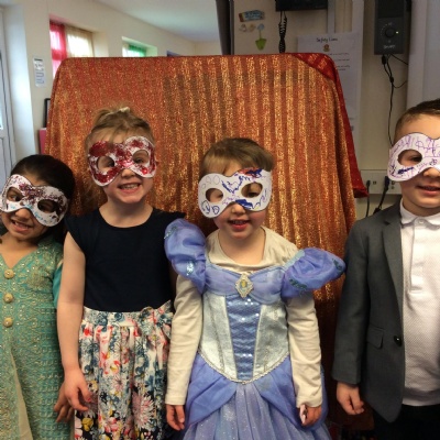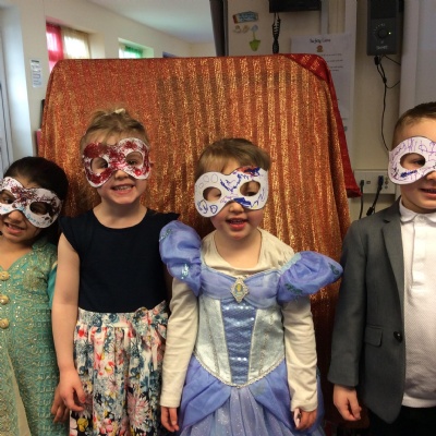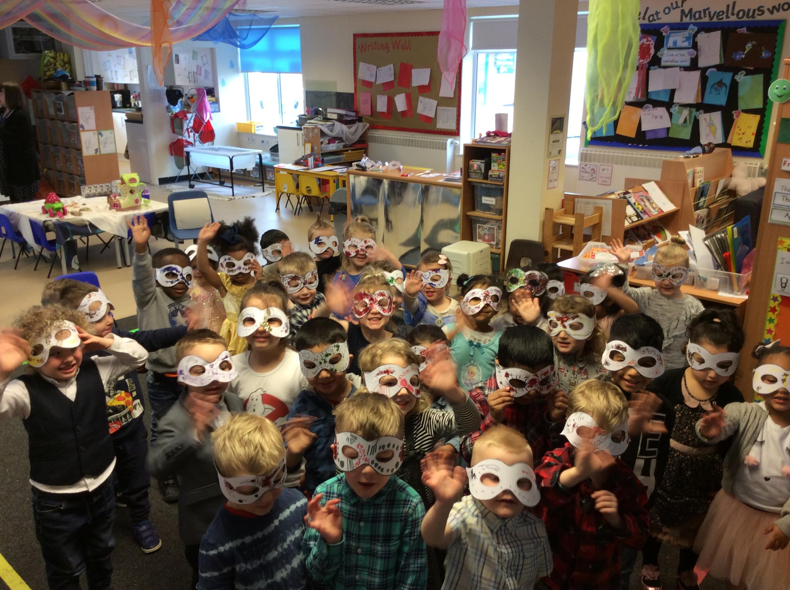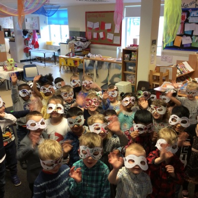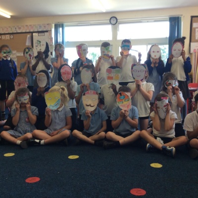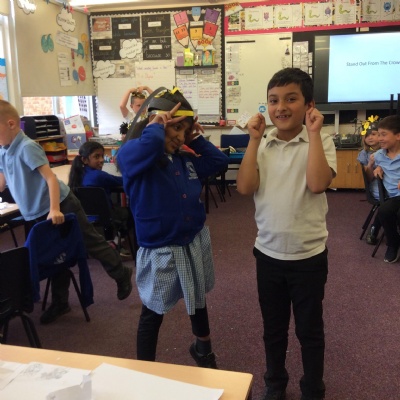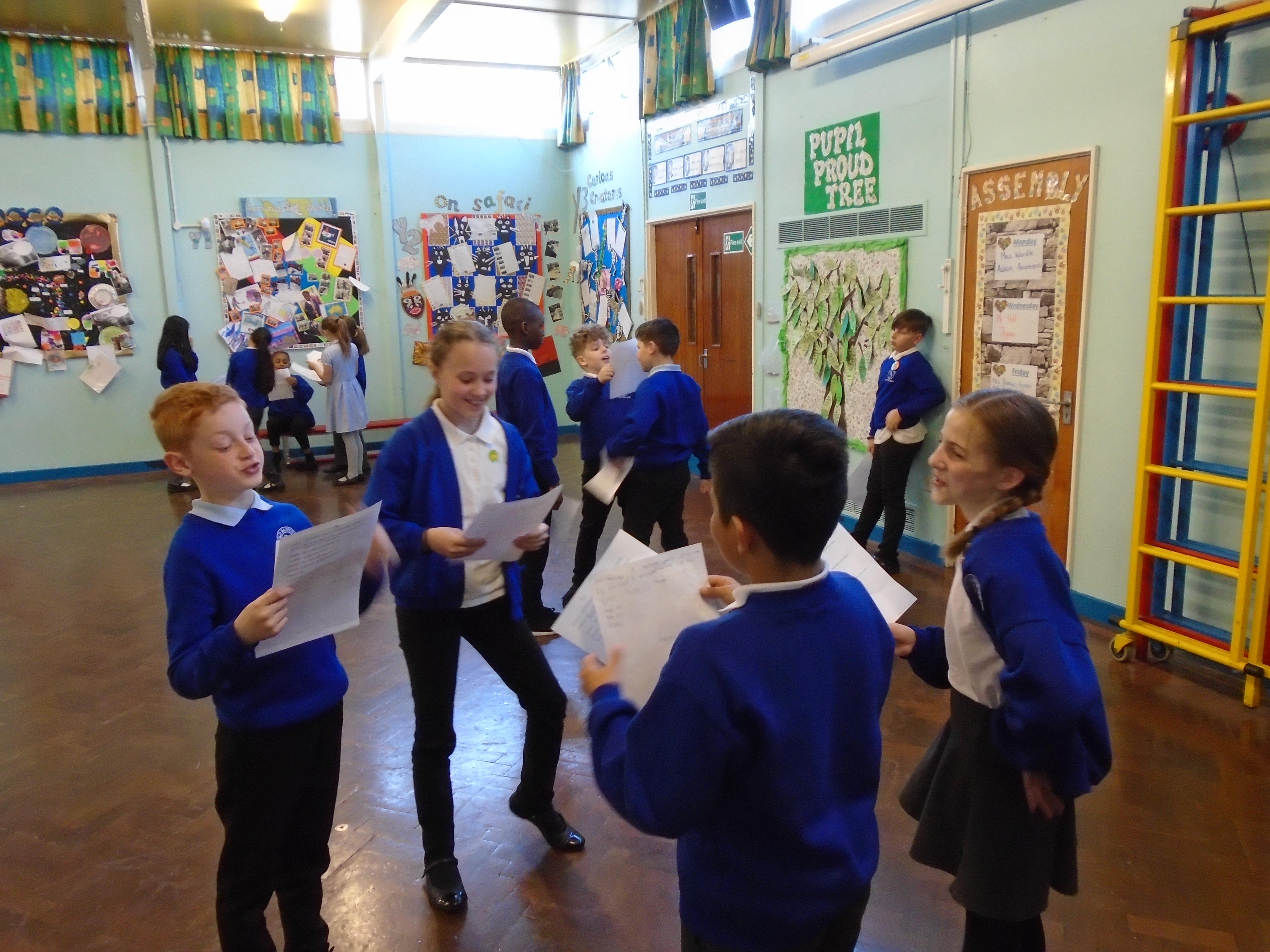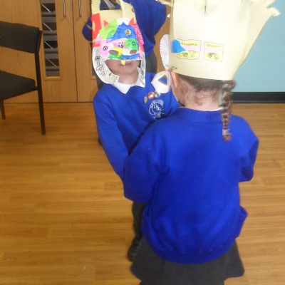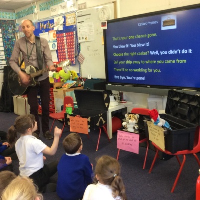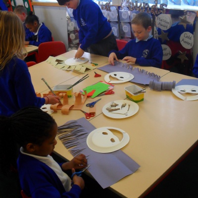 We were fortunate to work alongside an RSC associate artist, musician and dramatist. Three year groups were fortunate to have a day which each of the artists and gain from their expertise. The musician, Liam Maloy worked with the classes in F2 and taught them songs that he had specially written and got them dance along and accompany him with percussion instruments. Liam's songs are very catchy and the children quickly picked up the lyrics and could join in. They loved it! Jane Stockley, the artist, worked with the Year 2 children to create masks for the Capulet masquerade ball, which they did, in fact, wear later in the week when they re-enacted the scene. As you will see from the photographs the masks were made from paper, paper plates and some very clever cutting and folding techniques. They looked fantastic! The Year 5 children were fortunate to work Martha Toogood who worked on the children's drama techniques. The classes then used the scenes to perform in their parent achievement assembly.