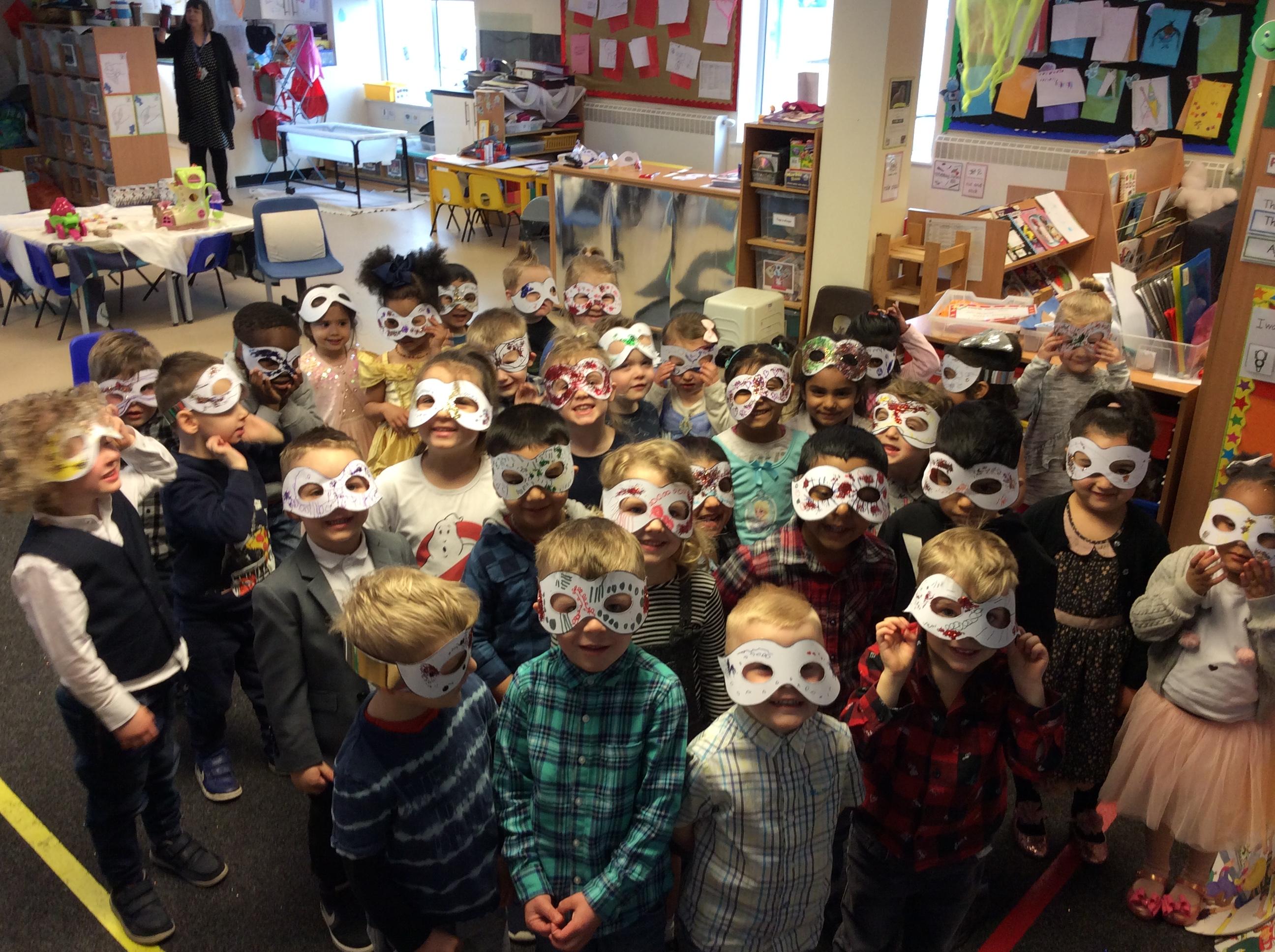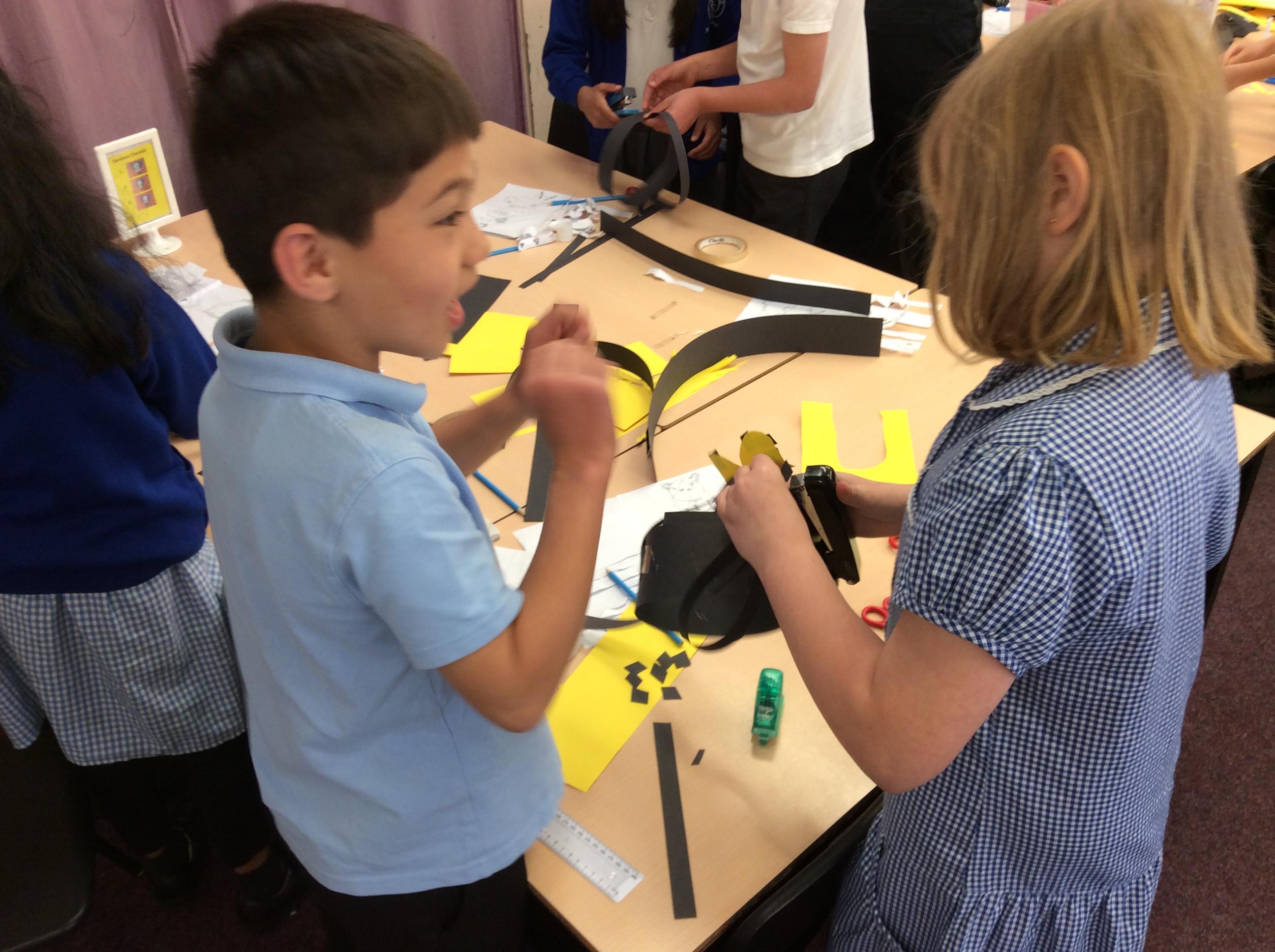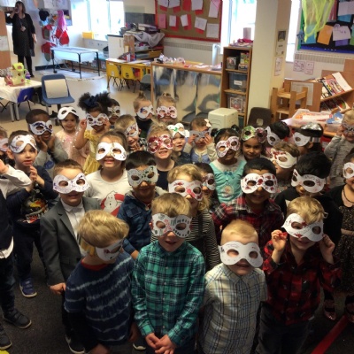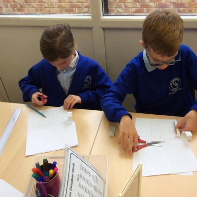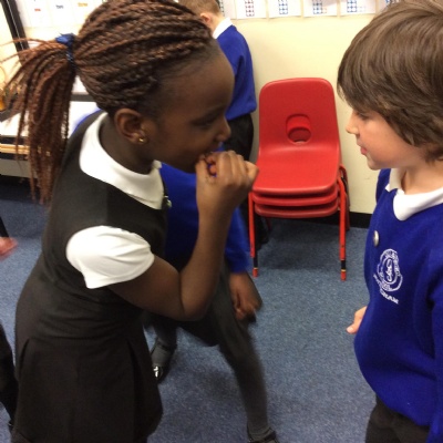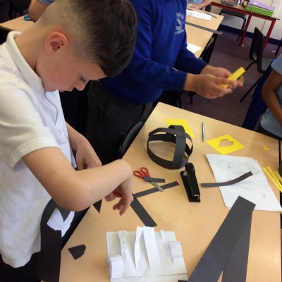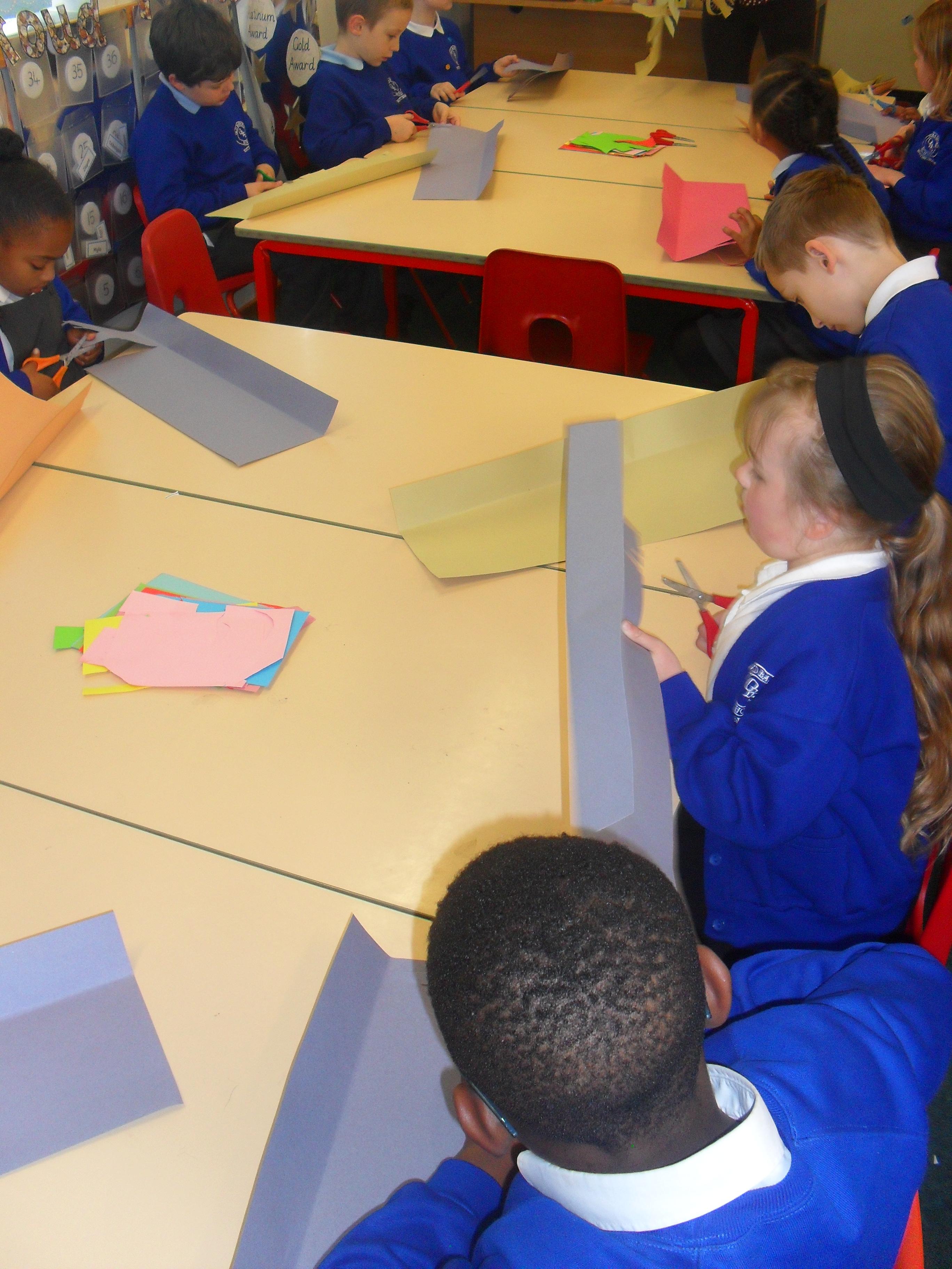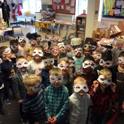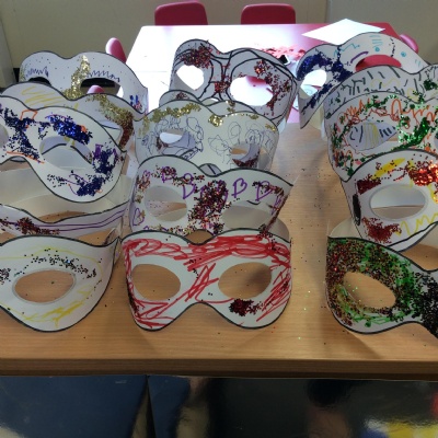 We were fortunate to work alongside an RSC associate artist, musician and dramatist. Three year groups were fortunate to have a day which each of the artists and gain from their expertise. The musician, Liam Maloy worked with the classes in F2 and taught them songs that he had specially written and got them dance along and accompany him with percussion instruments. Liam's songs are very catchy and the children quickly picked up the lyrics and could join in. They loved it! Jane Stockley, the artist, worked with the Year 2 children to create masks for the Capulet masquerade ball, which they did, in fact, wear later in the week when they re-enacted the scene. As you will see from the photographs the masks were made from paper, paper plates and some very clever cutting and folding techniques. They looked fantastic! The Year 5 children were fortunate to work Martha Toogood who worked on the children's drama techniques. The classes then used the scenes to perform in their parent achievement assembly.
