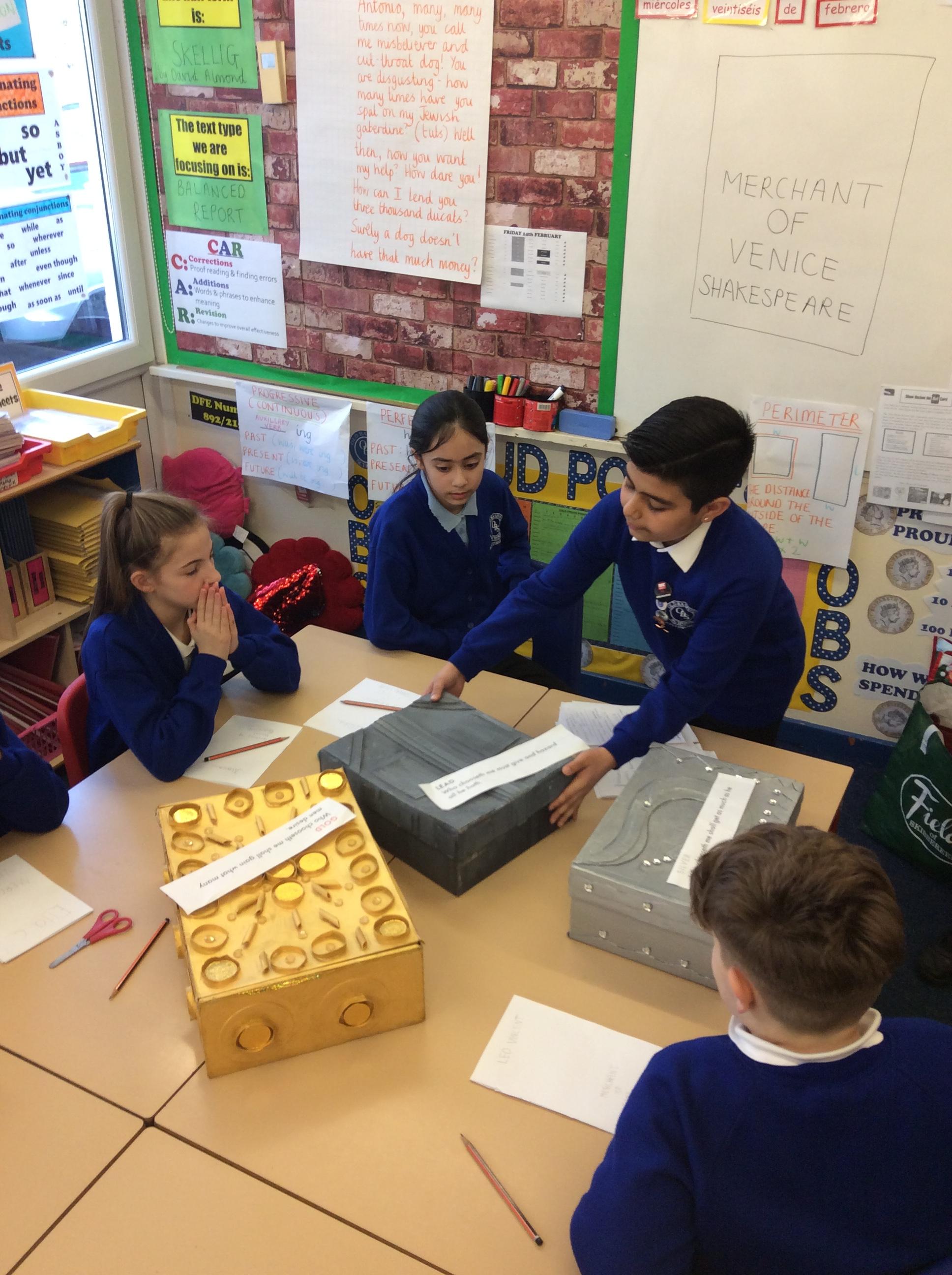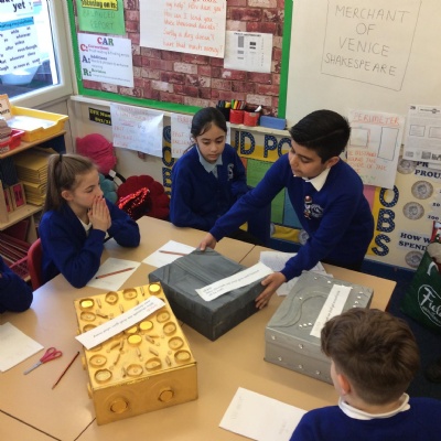 As a Royal Shakespeare Company Lead Associate School, every year we focus on one of Shakespeare's plays for a whole week. This year we have all been immersed in 'The Merchant of Venice' which is a tale of love, prejudice, revenge and justice. Each year group has looked at parts of the play (appropriate for their age), reading the text, using drama to bring the text to life and using the language to influence their own writing. We have also used cross-curricular lessons to explore the story and the setting of Venice. We have had visits and support from an artist in Year 6, a drama specialist in Years 3 and 4 and a musician in Year 1. That is a total of 240 children who have received specialist creative arts input. We finished the week with a celebratory assembly looking at some of the work that has gone on. The quality of the work was absolutely amazing. Some of the children had used quotes or phrases from the text in their own pieces of writing. Some children had rewritten parts of the play into modern day language or were inspired to write their own play scripts with stage directions to perform in front of their peers. Some children had used quotes from Shakespeare to help illustrate pictures. Others had created scenes of Venice through different media. Overall there was a wealth of activities that had gone on throughout the week. Some of this work has been displayed in the main corridor- come and take a look next time you are in school! If you would to see work that your child has done during the week, please go to their class page on the website.