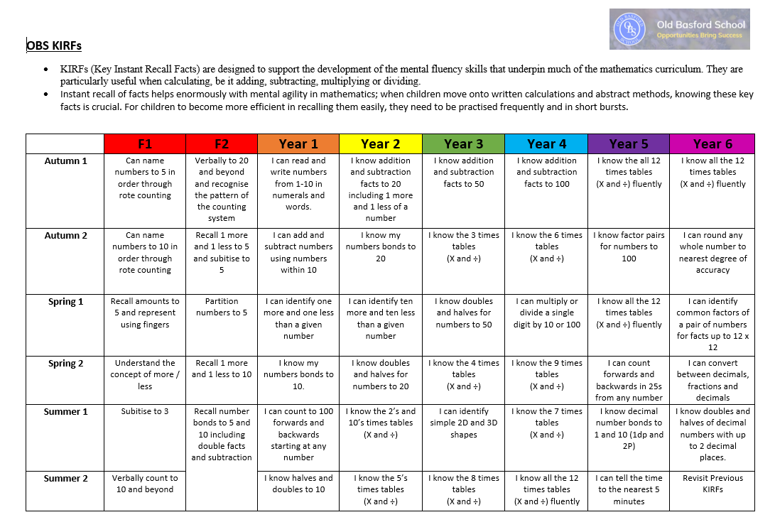 In year 1 we really embed the basics to become confident in all areas of maths. We are beginning to use Key Instant Recall Facts (KIRFs) to ensure your child has speedy recall of essential maths facts. Your child should know them quickly as they will help them in all areas of maths. Please find the KIRFs for year 1 below with some helpful hints. In the Autumn term we are focussing on knowing our numbers to 10, their value and how to write them in numerals and words.