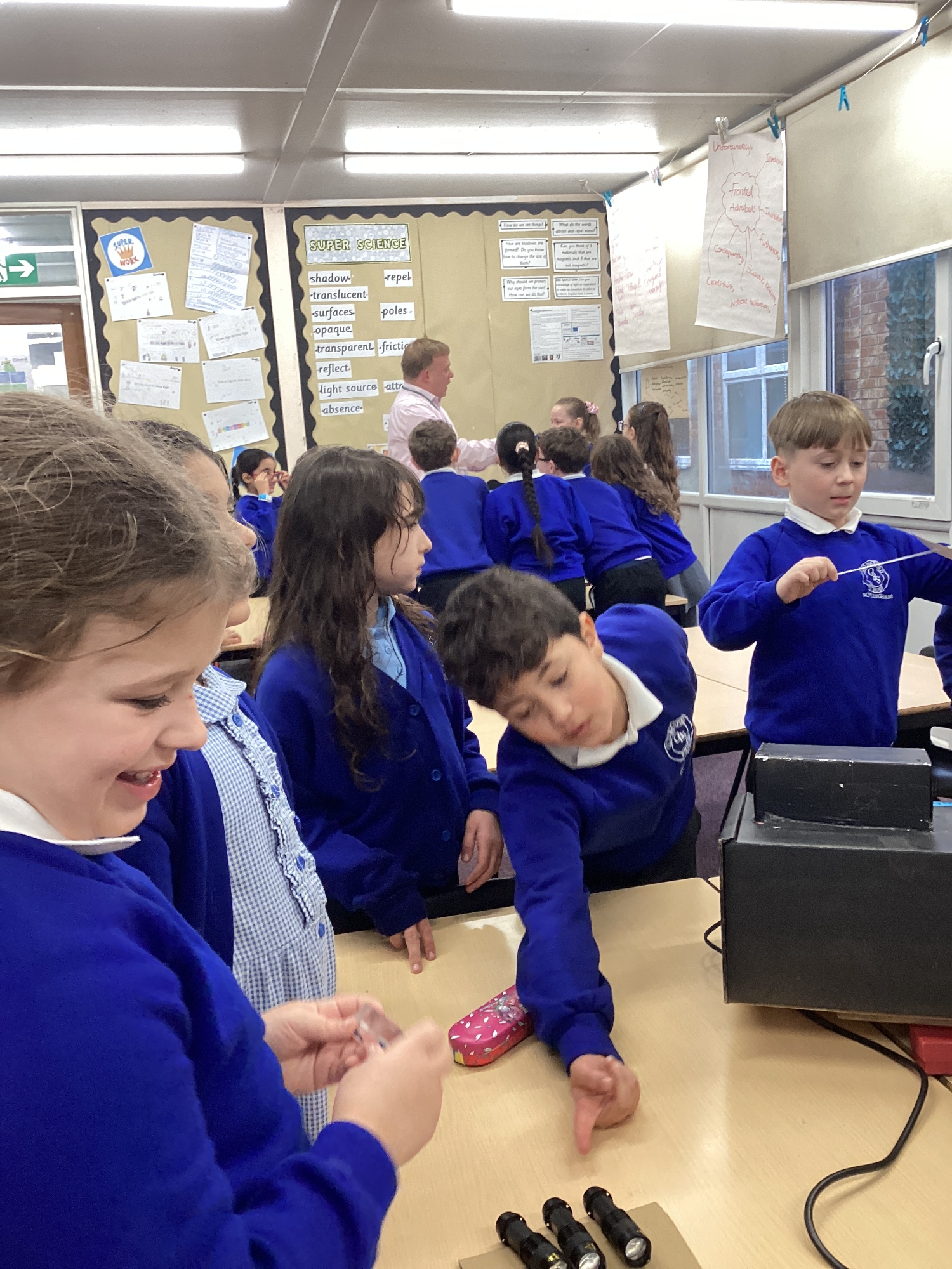 Using torches and natural light, the children experimented with making shadows bigger and smaller by moving objects closer to or farther from the light source. They also enjoyed looking closely at the patterns shadows make.
