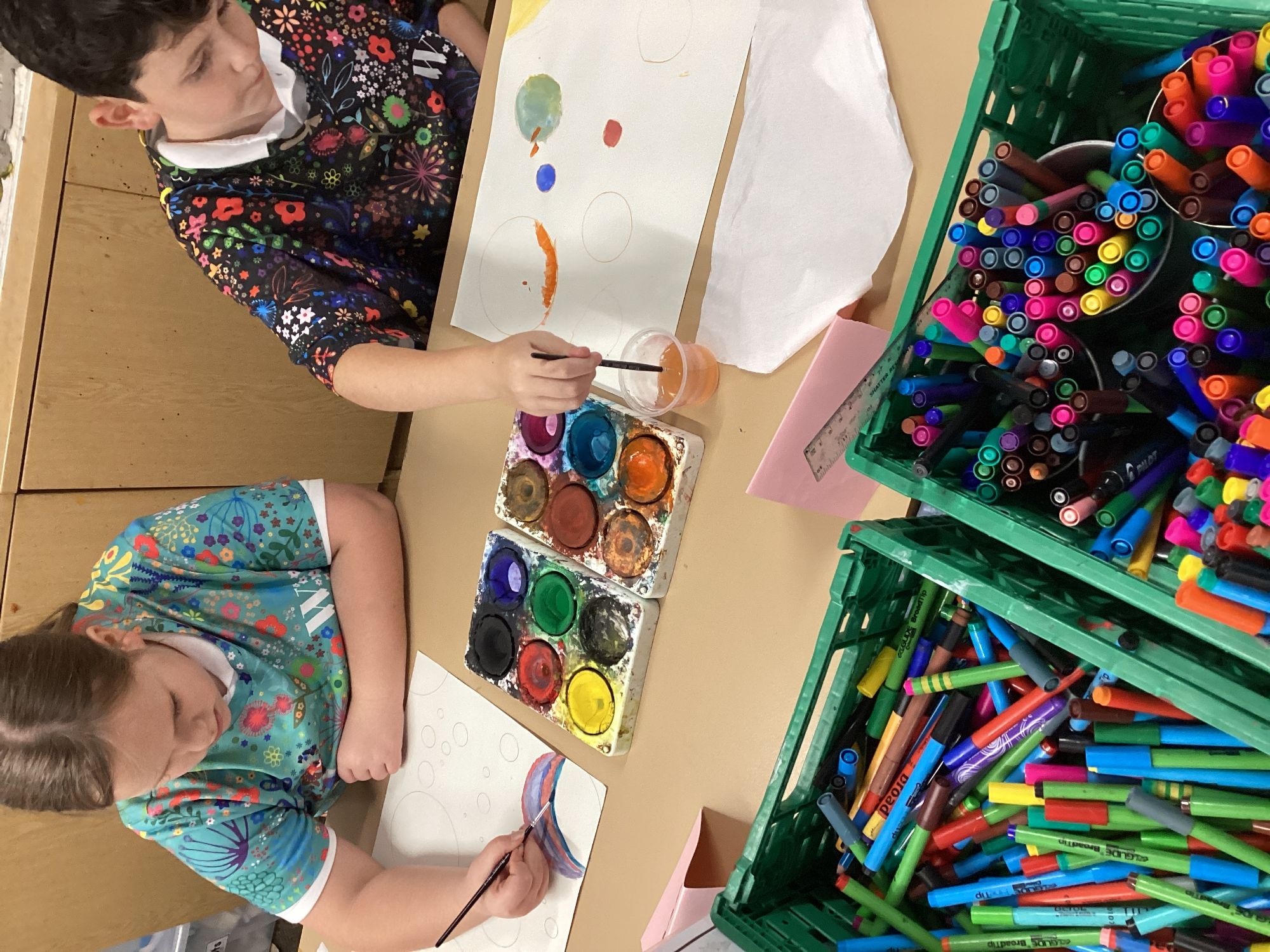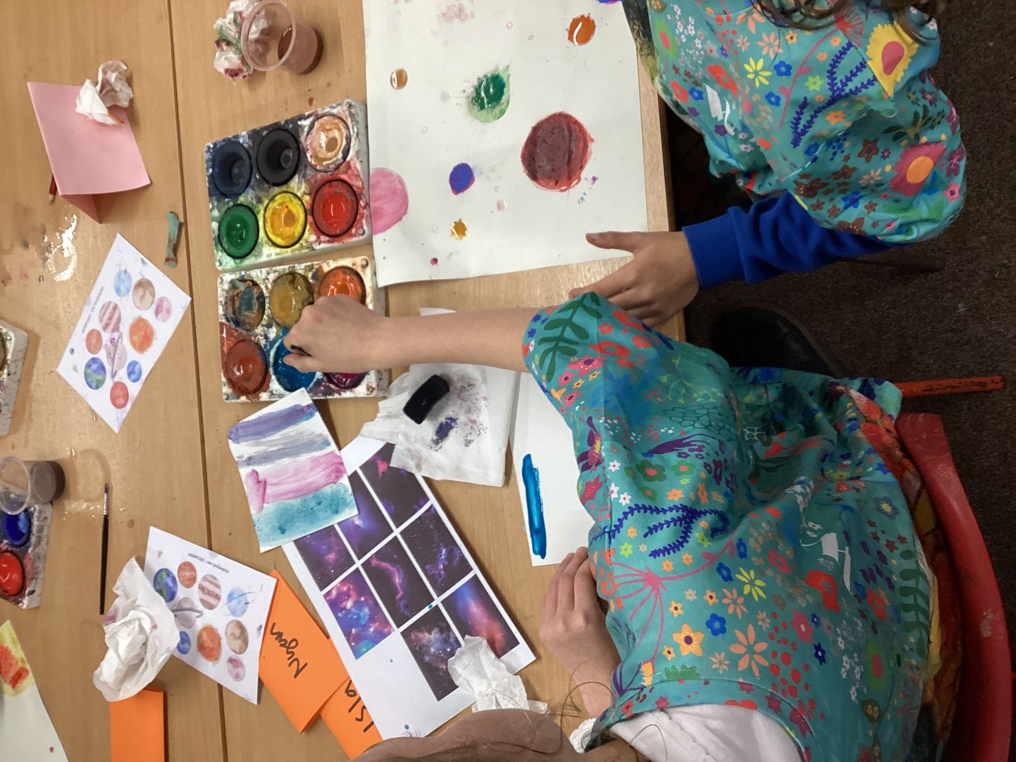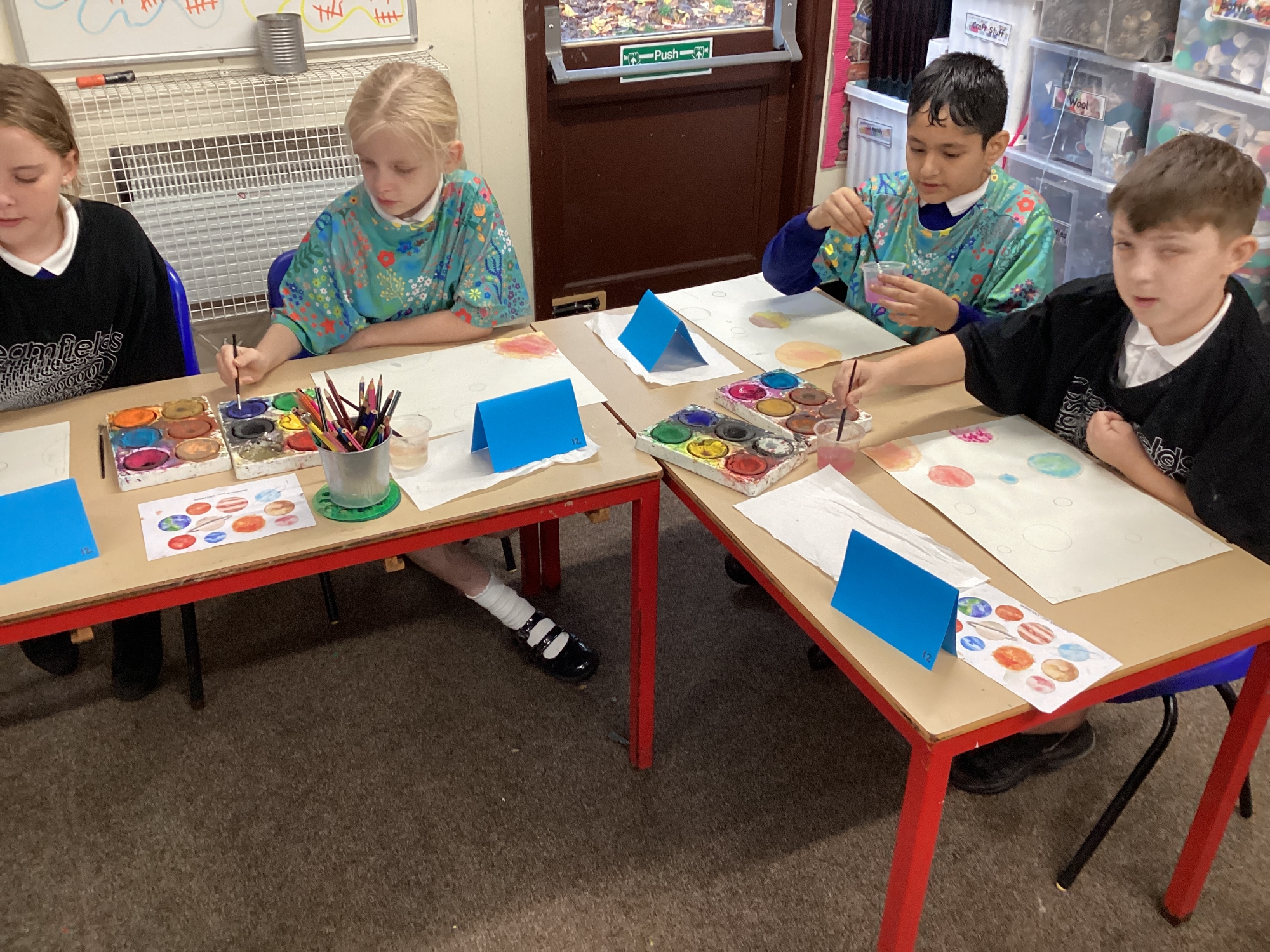 This afternoon, Year 5 continued their amazing art with Mrs Maker. After drawing our planets, we used watercolours, brushes, and sponges to add lots of fantastic patterns and colours to our paintings. We can’t wait to carry on next week!